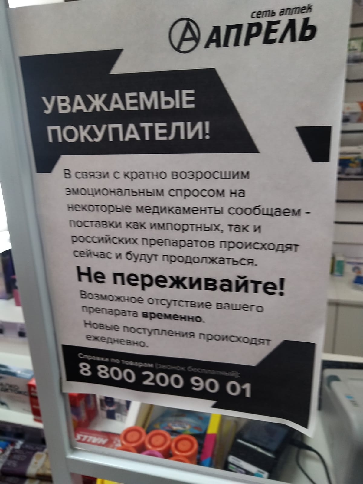 Так, по его информации, в сети аптек «Апрель» размещены объявления о том, что возможное отсутствие препаратов является временным и связано с «кратно возросшим эмоциональным спросом на некоторые медикаменты». Провизор рассказал Крым.Реалии, что на сегодняшний день в аптеке действительно сильно сократился ассортимент и есть проблемы с доставкой.