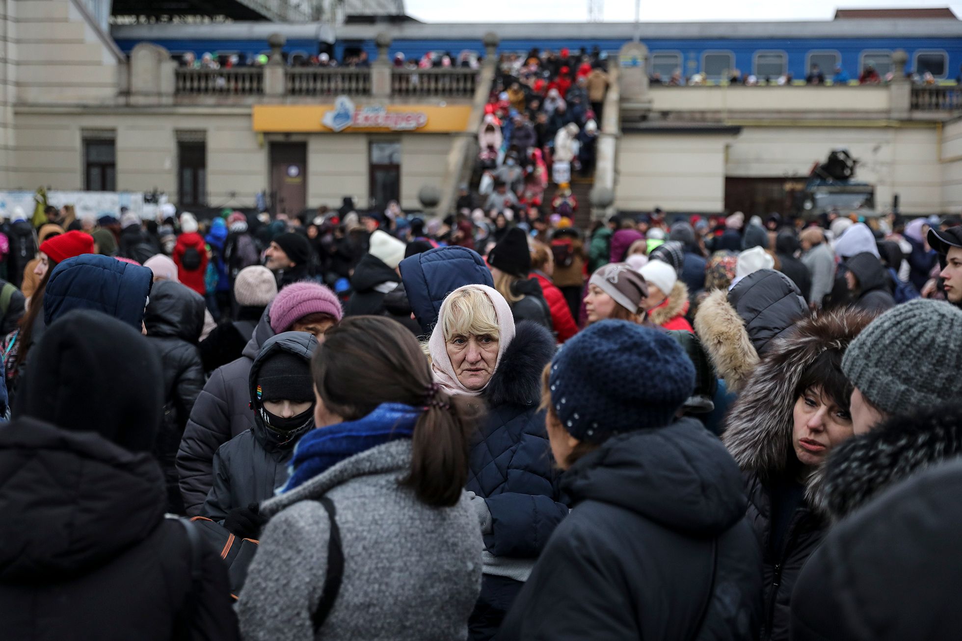 Главный железнодорожный вокзал Пшемысля — небольшая постройка XIX века — переполнен. Елена Кузьмицкая из города Лозовая Харьковской области сидит на корточках, прислонившись к стене, в окружении сумок с вещами. У нее уставший вид и красные от слез глаза.