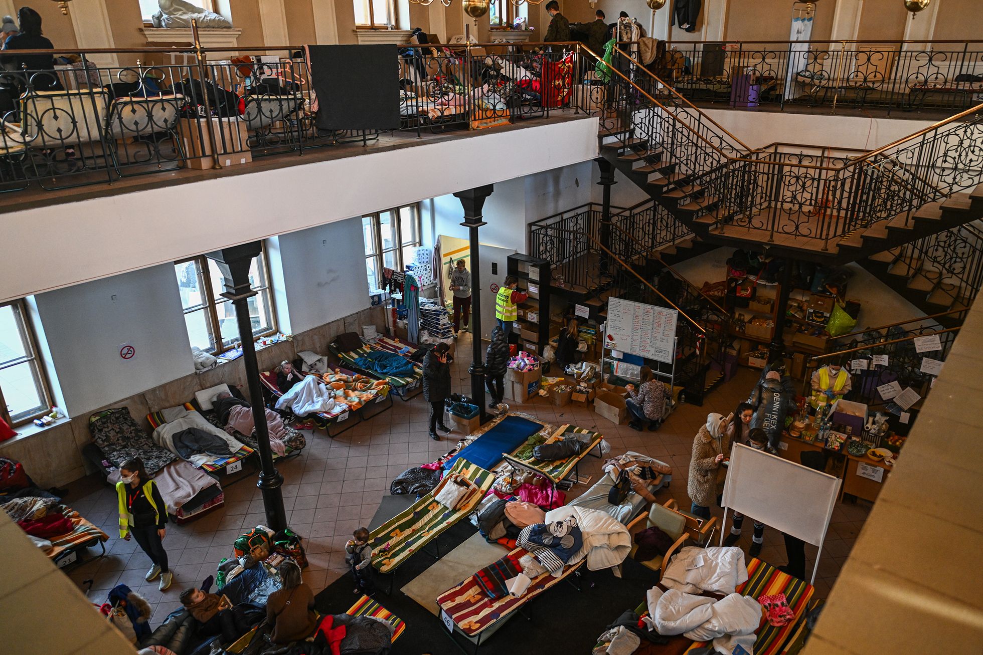 Жилье беженцам бесплатно предоставляют местные жители и отели. Но некоторые в ожидании своего рейса ночуют на вокзале. Зал, где расположены кассы, уставлен чемоданами, пакетами, детскими колясками и переносками для животных. Одни сидят на туристических ковриках — карематах. Другие — на сумках или просто на полу. Одни раскладывают вокруг себя пледы, стараясь придать обстановке хотя бы немного домашнего уюта. Другие обнимают детей или домашних животных и смотрят куда-то в пустоту.