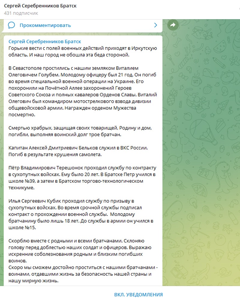 О гибели троих братчан написал в тг-канале 15 марта мэр города Сергей Серебренников.