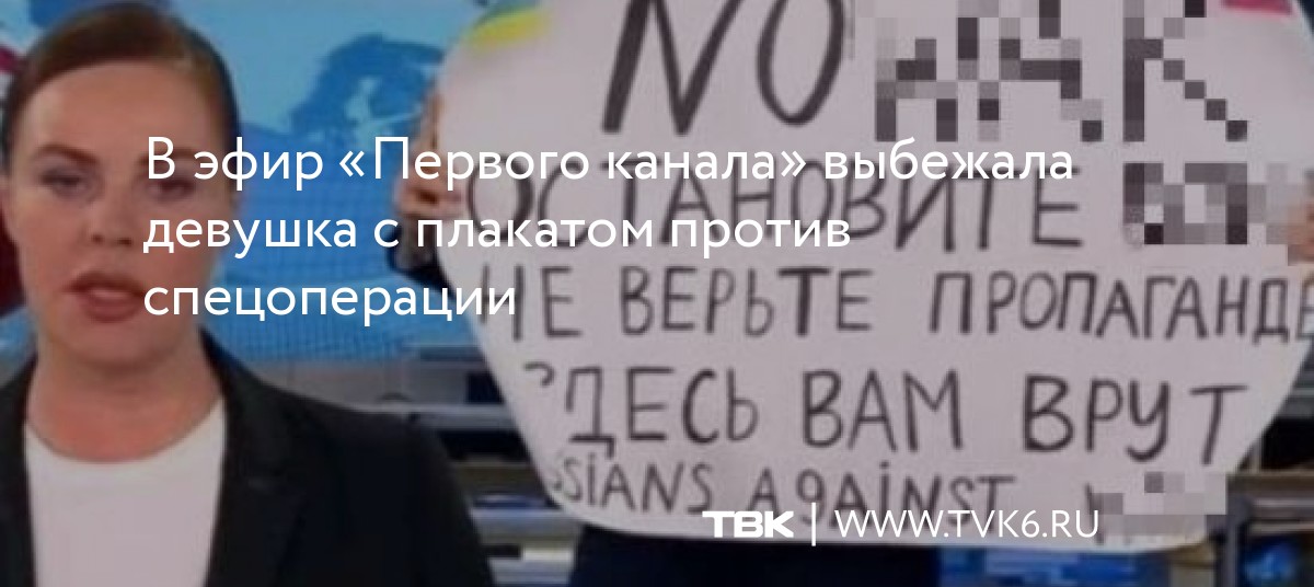 Девушка с плакатом забежала в кадр во время программы «Время», эфир прерывать не стали, передает РБК. Как сообщил адвокат Павел Чиков, это была редактор «Первого канала» Марина Овсянникова. Полное содержание ее плаката запрещают передавать Роскомнадзор и Уголовный кодекс.