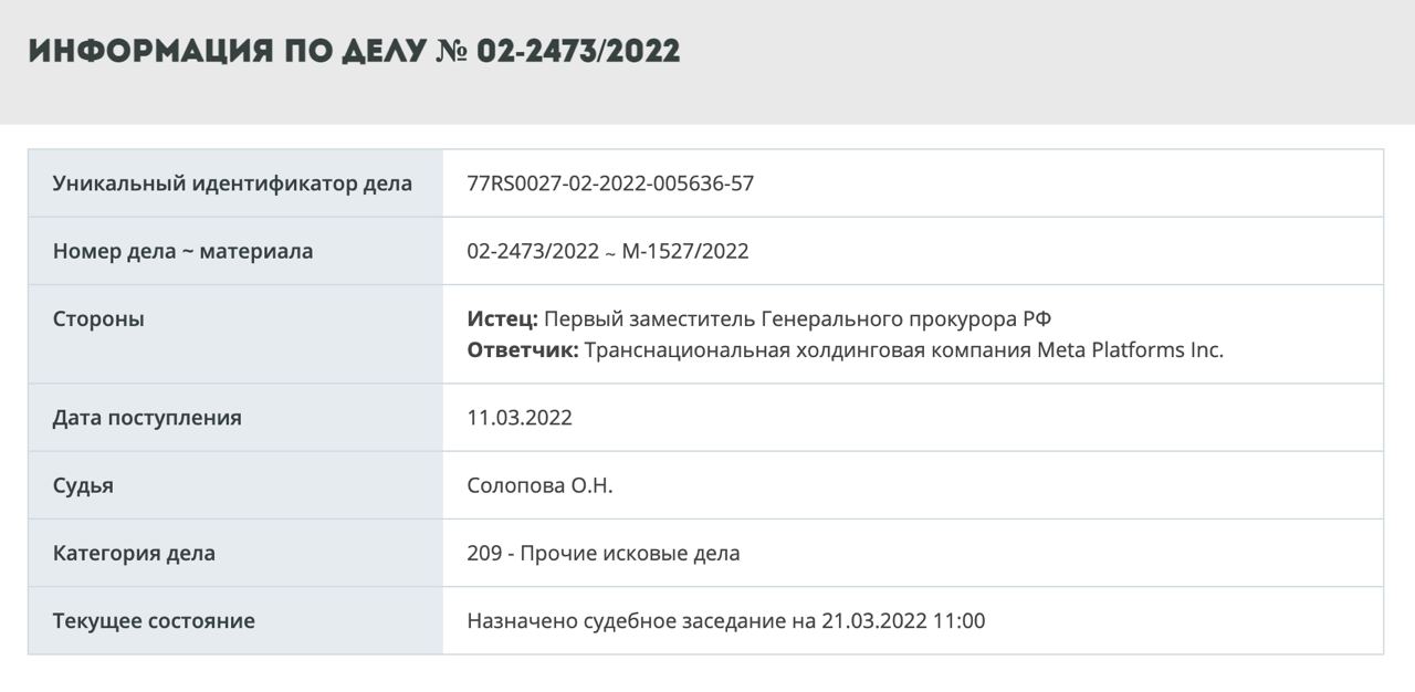 Иск прокуратуры о признании Meta «экстремистской организацией» будут рассматривать в Тверском районном суде Москвы. Карточка заседания появилась в базе московских судов общей юрисдикции.