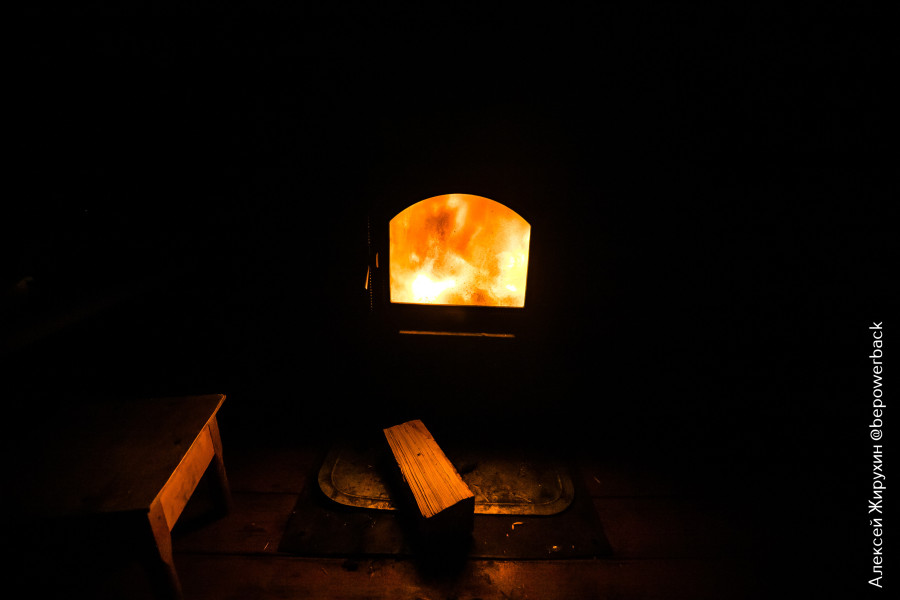 Ко входу затащили наколотых дров, на ночь вроде должно хватить. Печка греет хорошо, только чем дальше от нее, тем становится свежее, поэтому раскладушки пододвинули поближе. Чтобы ночью за дровами далеко не тянуться, их тоже накидали ближе к топке на расстояние вытянутой руки.