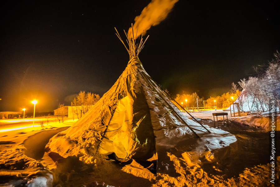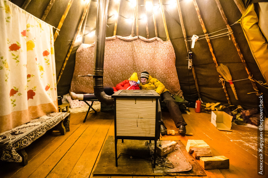 Эти чумы можно взять в аренду и переночевать, есть зимние и летние, с печкой и без. Но как на зло, с зимнего чума в это время сняли шкуры оленя (которые служили для утепления) и увезли на какое-то мероприятие. На улице -30, а когда еще раз такой шанс выпал бы, сложно предугадать, поэтому я попросил подготовить мне чум и затопить печь.