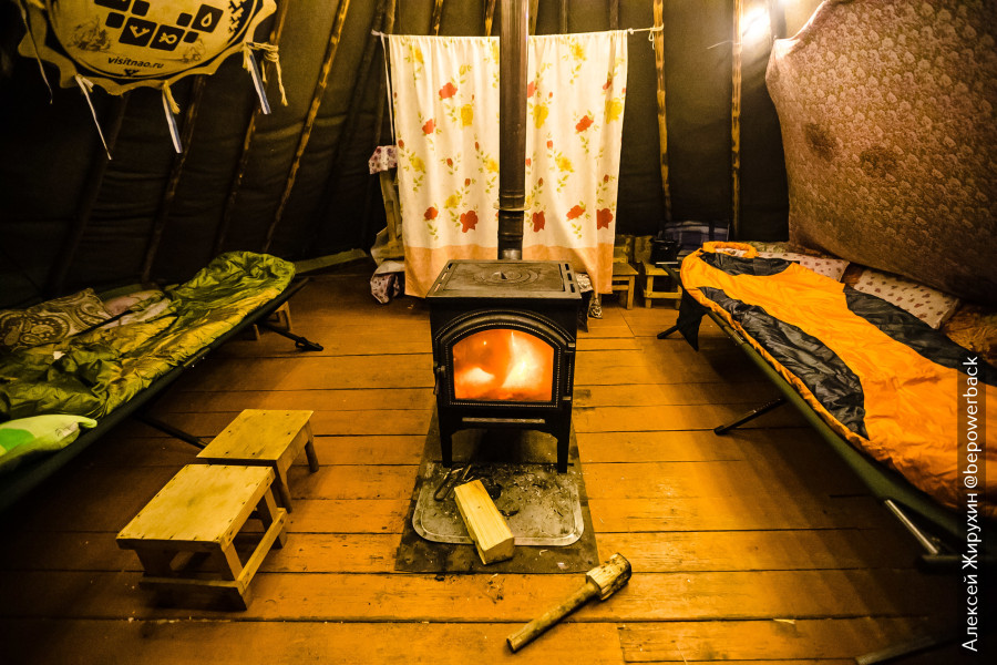 Растопили печь посильнее, выключили свет, легли спать. Просыпаюсь от жуткого холода, смотрю, что поспал не более часа, в топке догорают головешки, быстро подкинул еще, дрова быстро разгорелись и снова стало тепло, заснул. Снова просыпаюсь от холода, поспал еще час, дрова снова все прогорели, накидал еще и лег спать. В общем, так каждый час до самого утра и пришлось подкидывать дров, ибо прогорали они быстро, а тепло в чуме не держалось от слова совсем. Не выспался, но реализовал давнюю мечту, теперь нужно сформулировать желание так, чтобы переночевать еще раз, но уже в теплом чуме.