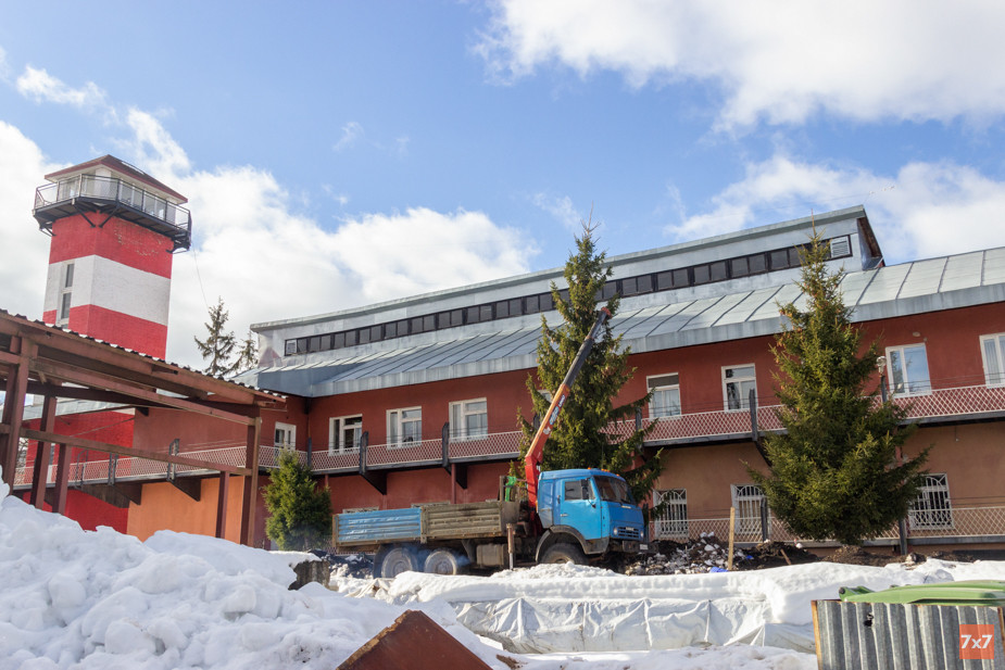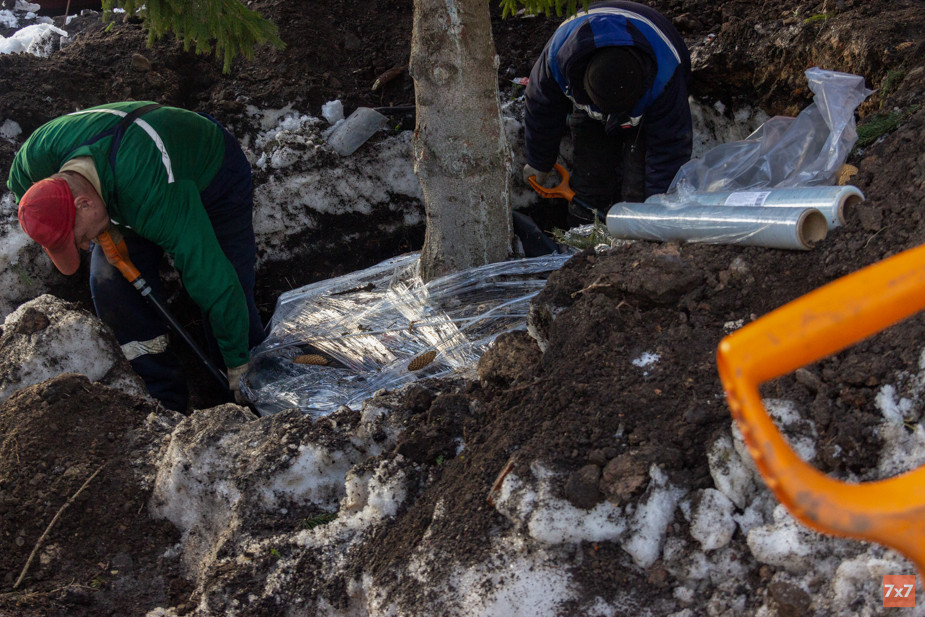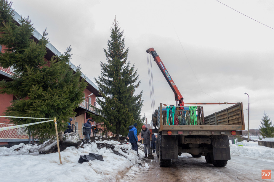 Возле «Клуба юных моряков» в Великом Новгороде кран-манипулятор шатает взрослую ель, а рабочие подкапывают землю, чтобы вытащить дерево с корнями. Температура воздуха на улице — около ноля градусов, вокруг лежит снег. Конец февраля — не время для пересадки, но иначе три ели у КЮМа могли погибнуть. Прямо под ними проходят коммуникации, которые мэрия решила срочно отремонтировать.