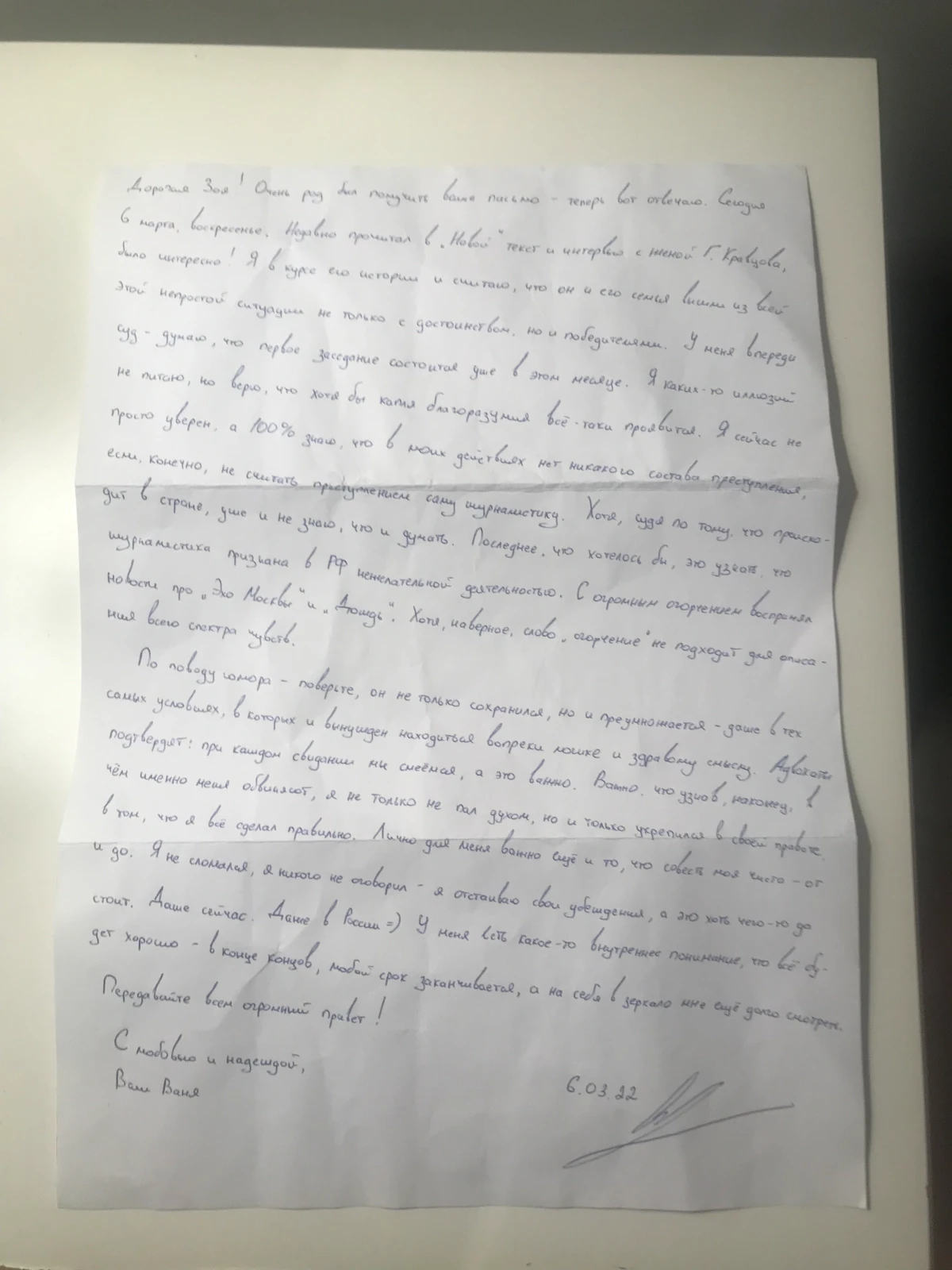 «Дорогая Зоя! Очень рад был получить ваше письмо — теперь вот отвечаю. Недавно прочитал в «Новой» текст и интервью с женой Г. Кравцова*. Было интересно! Я в курсе его истории и считаю, что он и его семья вышли из всей этой непростой ситуации не только с достоинством, но и победителями. У меня впереди суд — думаю, что первое заседание состоится уже в этом месяце. Я каких-то иллюзий не питаю, но верю, что хотя бы капля благоразумия все-таки проявится. Я сейчас не просто уверен, а 100 процентов знаю, что в моих действиях нет никакого состава преступления, если, конечно, не считать преступлением саму журналистику. Хотя, судя по тому, что происходит в стране, уже и не знаю, что и думать. Последнее, что хотелось бы, это узнать, что журналистика признана в РФ нежелательной деятельностью.
