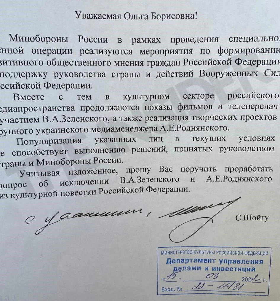 Глава Минобороны РФ Сергей Шойгу обратился к министру культуры Ольге Любимовой с просьбой исключить президента Украины Владимира Зеленского и продюсера Александра Роднянского из «культурной повестки». Соответствующий документ опубликовали «Медиазона»* и «The Insider»* со ссылкой на источник.