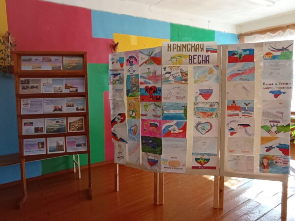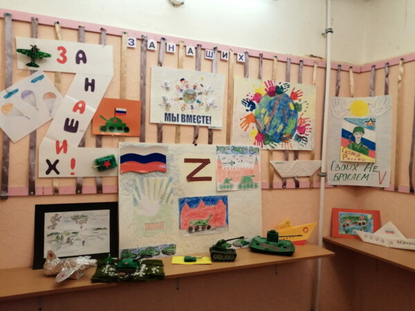 В части школ, детских садов и других образовательных учреждений устроили выставки из работ учеников и воспитанников, посвящённых «спецоперации» и Крыму.