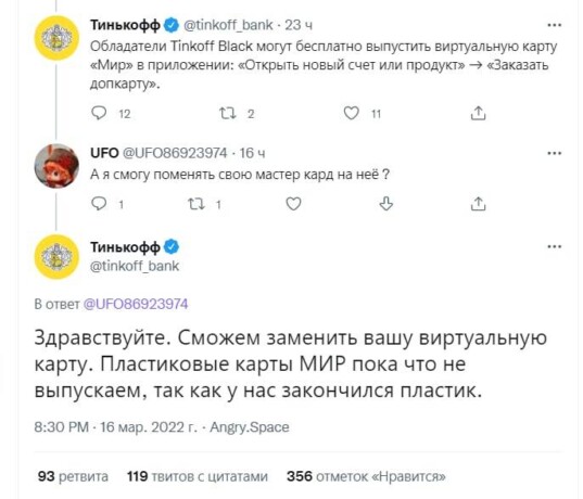 «Тинькофф» в обращении в твиттере уточнил, что «чуть погорячился»: у них есть пластиковый «Мир», с ним выдают карты. «Если коротко: мы можем выпускать пластиковые карты „Мир“ и иногда делать ошибки в твитах», — подчеркнул банк.