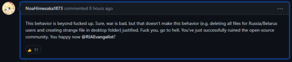 Действия RIAEvangelist, который поддерживает более 40 пакетов в npm, вызвали критику пользователей. Они указали, что действия разработчика выходят за рамки простого «мирного протеста». Некоторые добавляли, что потеряли доверие к разработчику и комьюнити в целом.