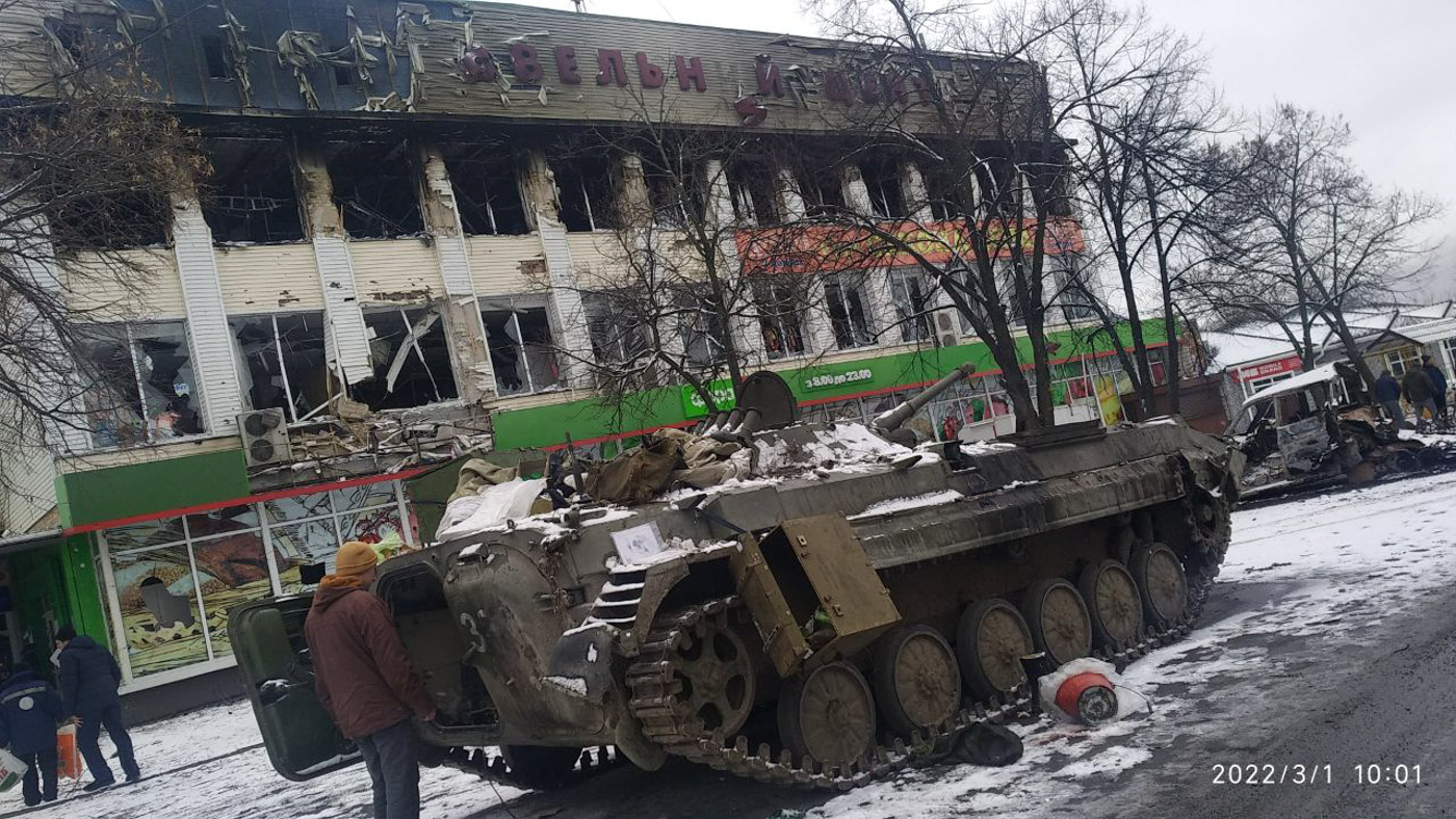 Они вот так и шли: одна башня повернула пушку направо, другая налево — и стреляли по домам, где-то на уровне 6-8 этажей. Просто тупо сносили населенный пункт. Никаких точек сопротивления в домах не было. Конечно, наши в первые дни дали отпор — на улице были подбитые и сожженые российские БМП. Я не знаю, кто там бился — тероборона или ВСУ, но они воевали на улице, не в домах.