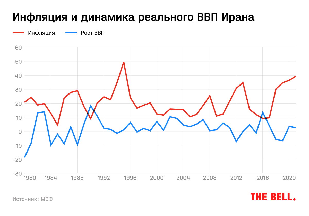 Введение санкций в отношении Ирана приводило к резкому снижению ВВП страны и росту инфляции. По данным МВФ, в 2012 году экономика Ирана упала на 7,4%, в 2018 году — на 6%. Инфляция подскочила выше 30% и до сих пор продолжает ускоряться. В 2021 году рост цен превысил 39%.