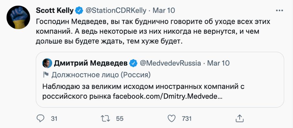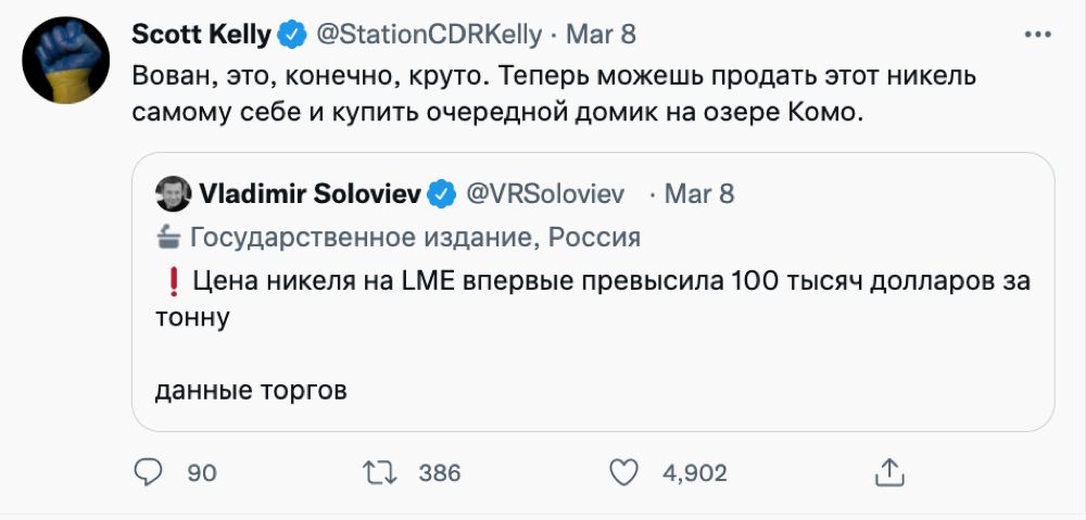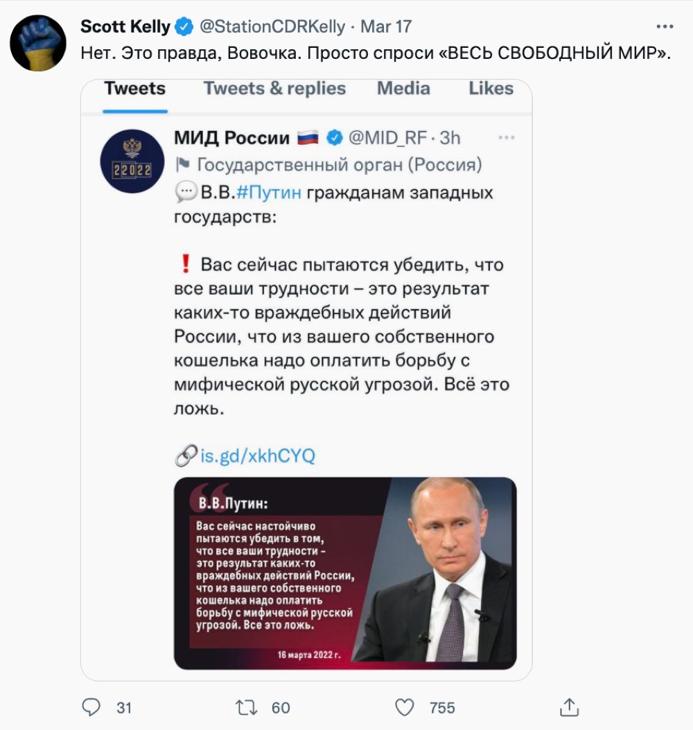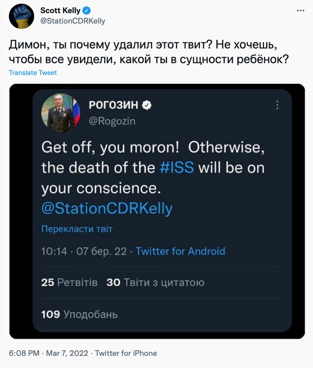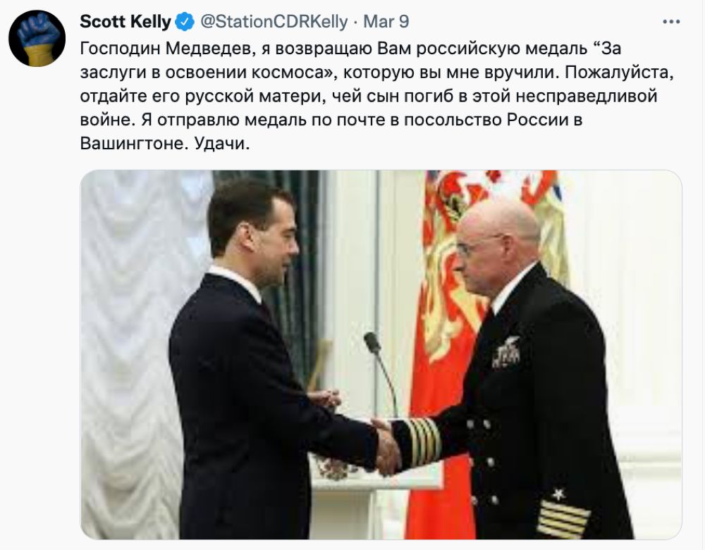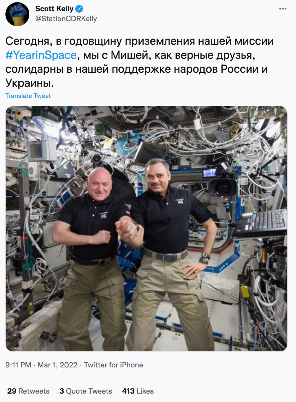 Американский астронавт Скотт Келли — участник и командир шести экспедиций на МКС. Он почти год провел на станции в паре с российским космонавтом Михаилом Корниенко. 25 февраля 2022 года, на второй день российского вторжения в Украину, Келли поменял свою аватарку в твиттере на сжатый кулак в цветах украинского флага и с тех пор каждый день пишет твиты на русском языке. Как и все астронавты на МКС, Келли учил русский (для общения в космосе он используется наравне с английским), но он признается, что этих знаний ему бы не хватило для написания твитов, поэтому с этим ему помогают. В своих твитах Келли то дразнит Путина и вступает в ожесточенные перепалки с главой Роскосмоса Дмитрием Рогозиным (которого он называем Димоном), то поддерживает россиян, выходящих на антивоенные протесты или разыскивает помощь для своих украинских знакомых. Мы поговорили с ним о том, зачем он это делает.