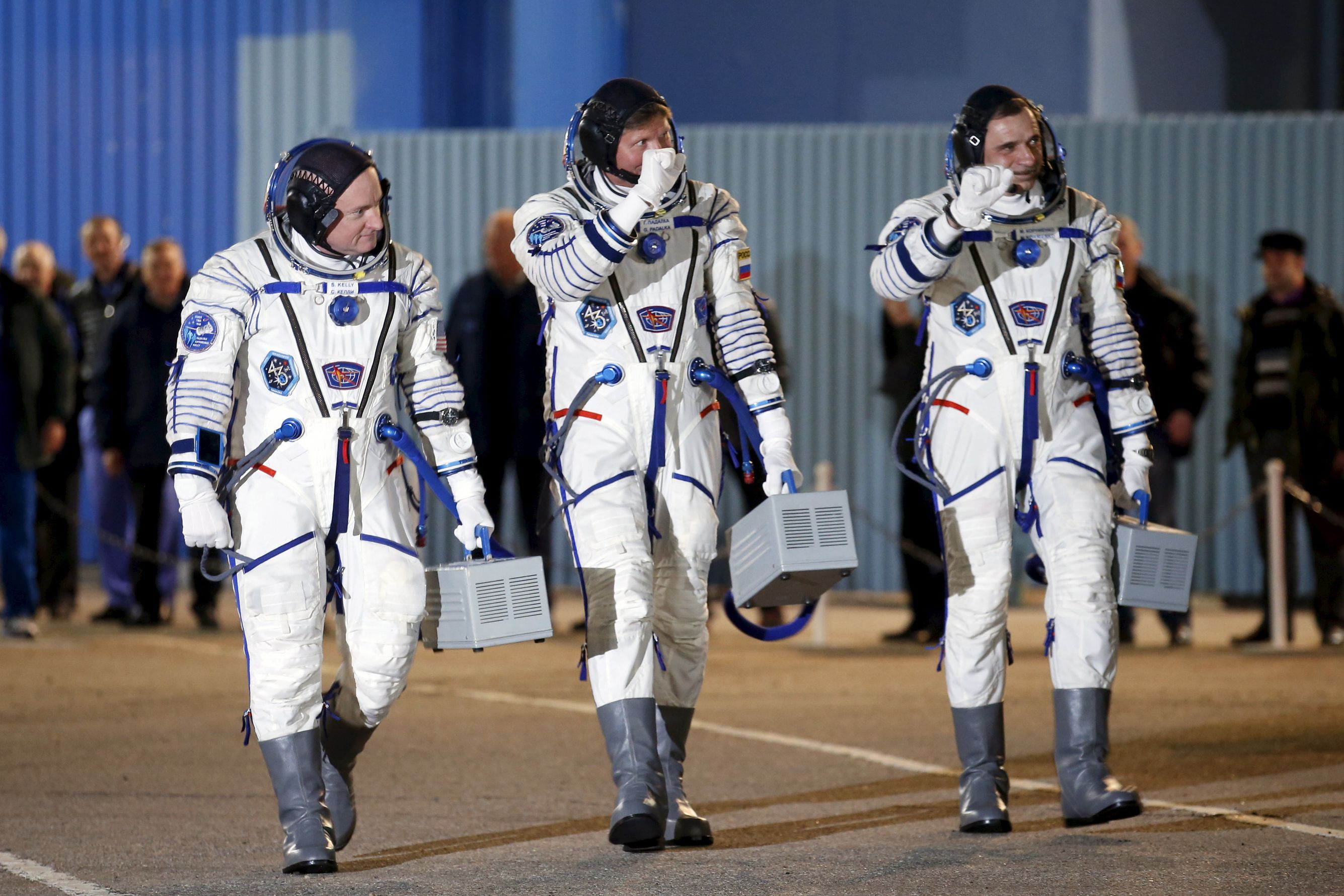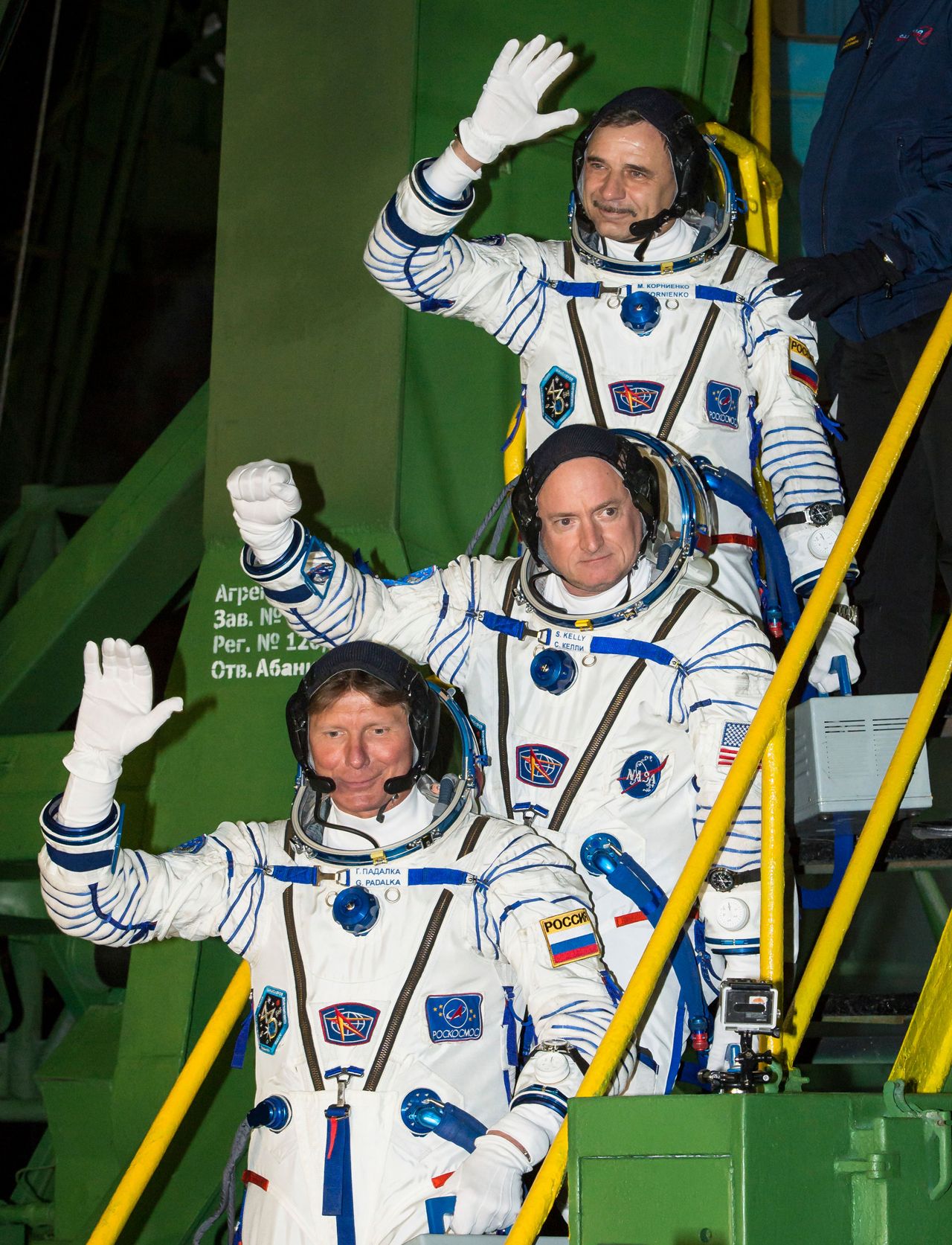 Максим Змеев / Reuters / Scanpix / LETA Экипаж 43-й экспедиции на МКС готовится к вылету с космодрома Байконур. Слева направо: Скотт Келли (США), Геннадий Падалка и Михаил Корниенко (Россия). 27 марта 2015 года