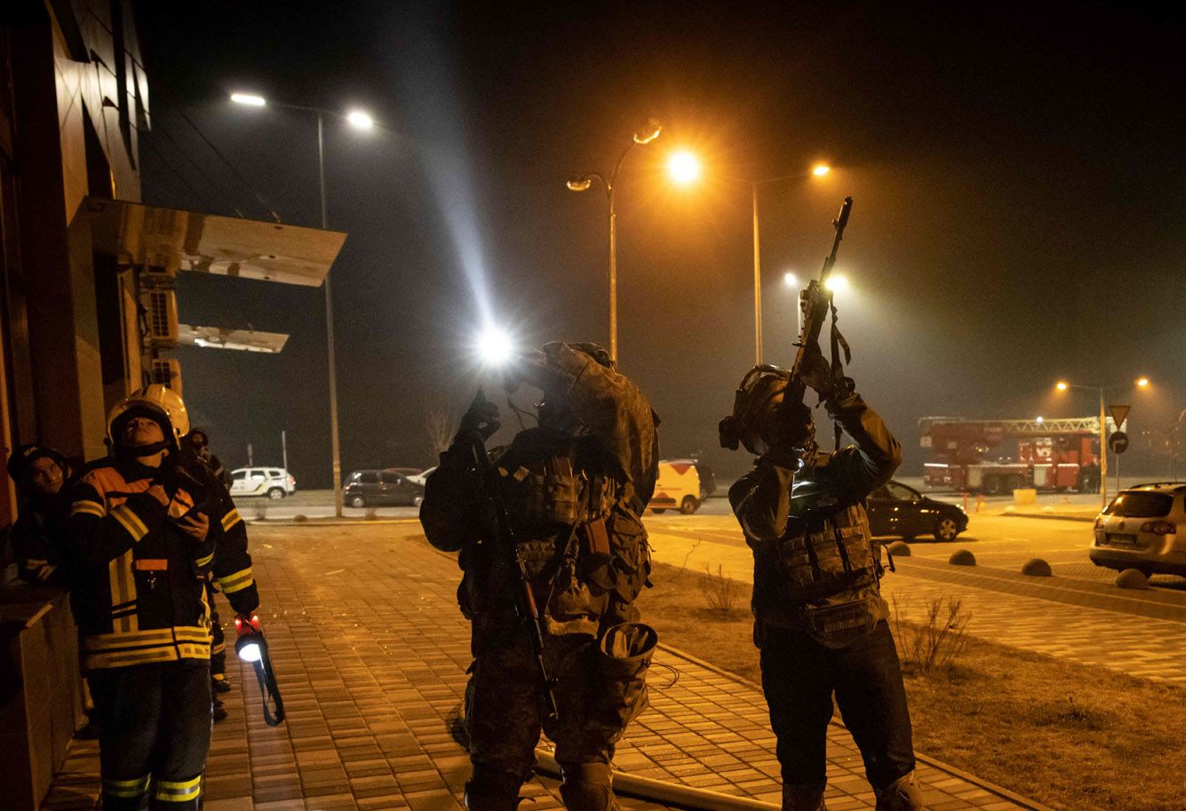 Fadel Senna / AFP / Scanpix / LETA Бойцы украинской территориальной обороны пытаются прицелиться в дрон, пролетающий мимо жилого дома в Киеве