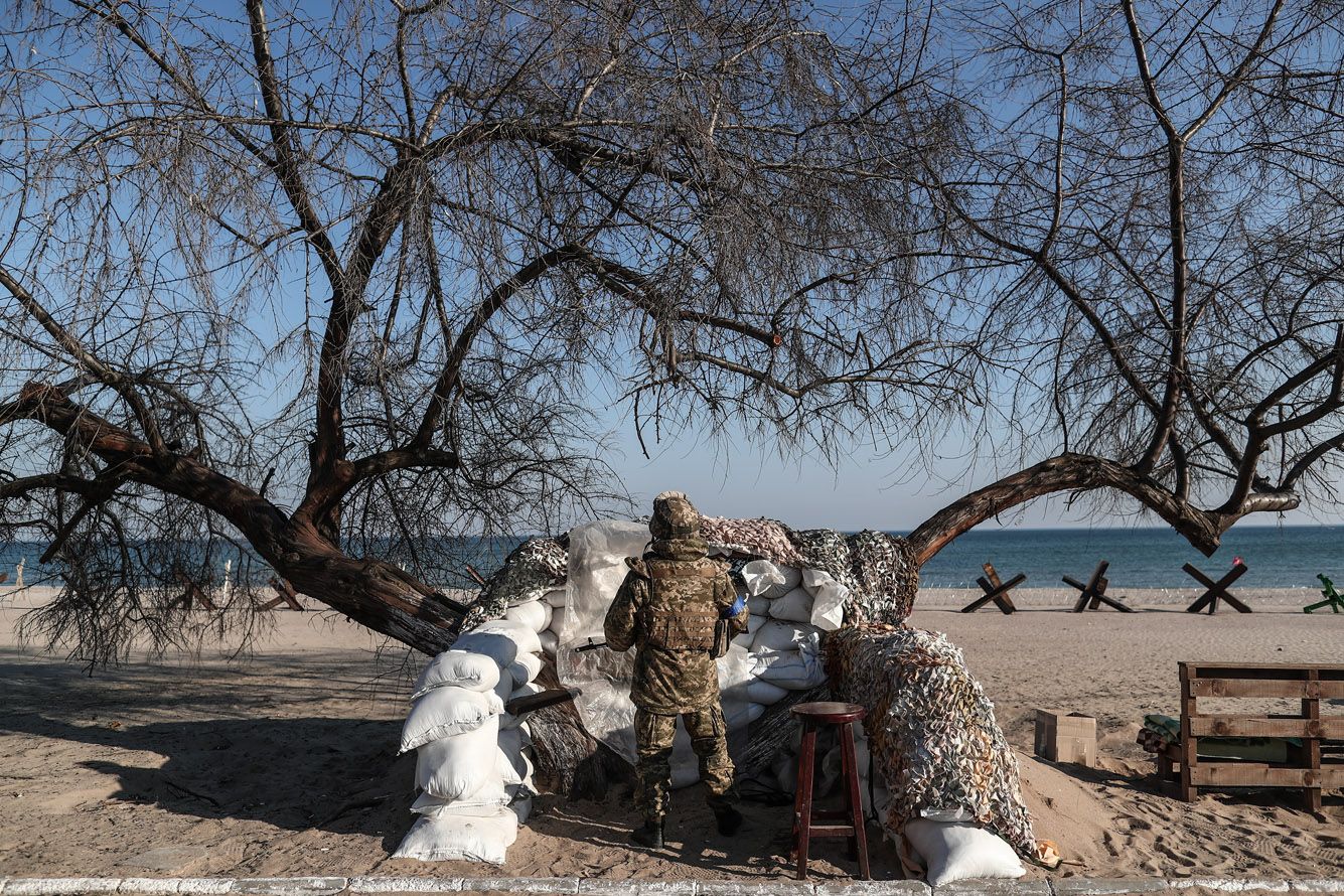 Sedat Suna / EPA / Scanpix / LETA Украинский солдат следит за морем на пляже в Лузановке — районе Одессы