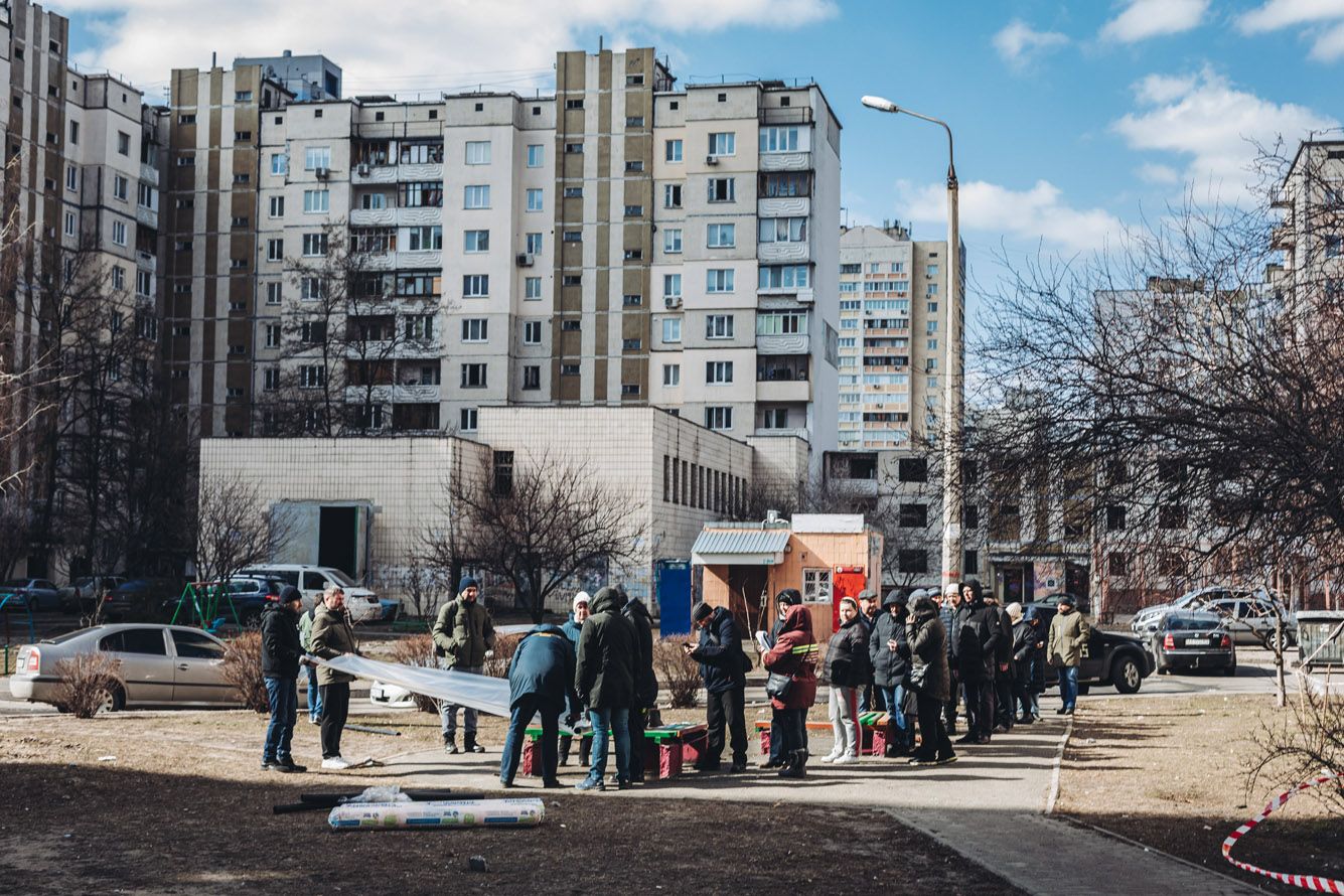Diego Herrera / Xinhua / Chine Nouvelle / SIPA / Scanpix / LETA Очередь за пластиковыми полотнами в Киеве. Такими полотнами люди закрывают разбитые в результате обстрелов окна