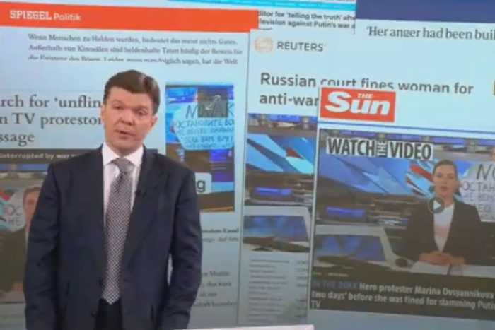 На Первом канале впервые прокомментировали антивоенную акцию своей сотрудницы Марины Овсянниковой. С речью о «предательстве» Овсянниковой в эфире программы «Время» выступил глава дирекции информационных программ Первого канала Кирилл Клейменов.