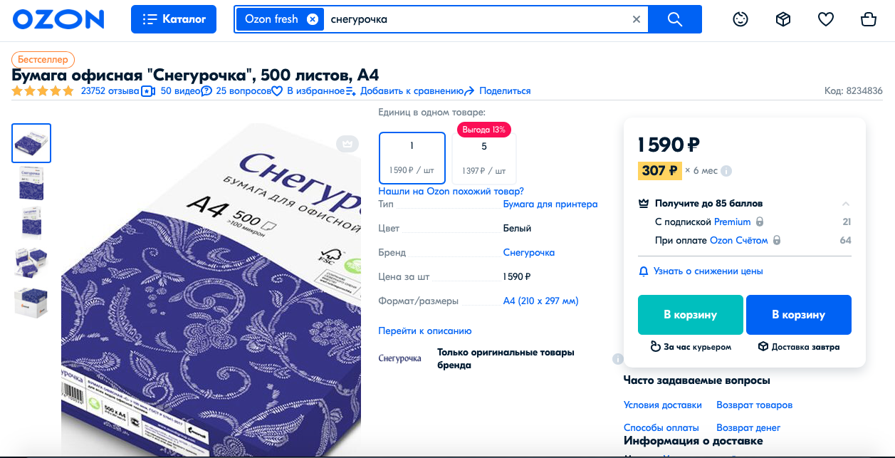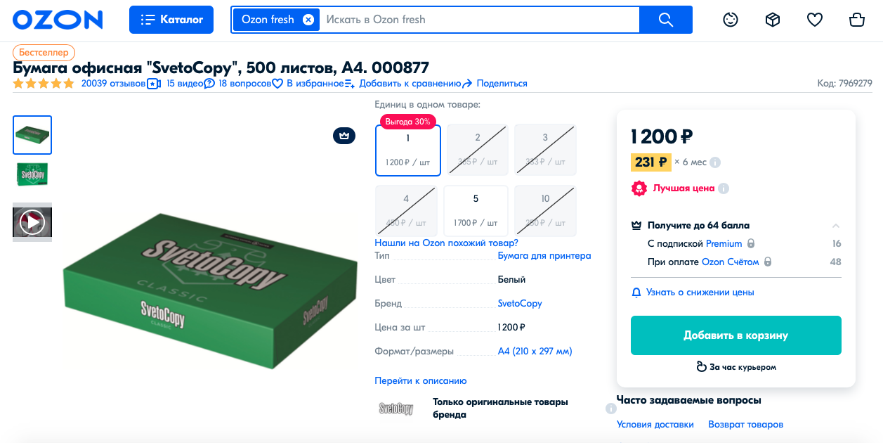 Чуть меньше подобная пачка от производителя SvetoCopy на 500 листов стоит на Ozon — 1,2 тысячи рублей. Онлайн-магазин уточняет, что это — «лучшая цена». В свою очередь, упаковка офисной бумаги «Снегурочка» обойдется уже в 1,5 тысячи рублей. Интернет-маркет Wildberries продает товар этих же марок в том же количестве листов по цене от 2 до 3 тысяч рублей. В онлайн-магазине «Комус» стоимость пачки под разными брендами варьируются от 888 до почти 5 тысяч рублей.