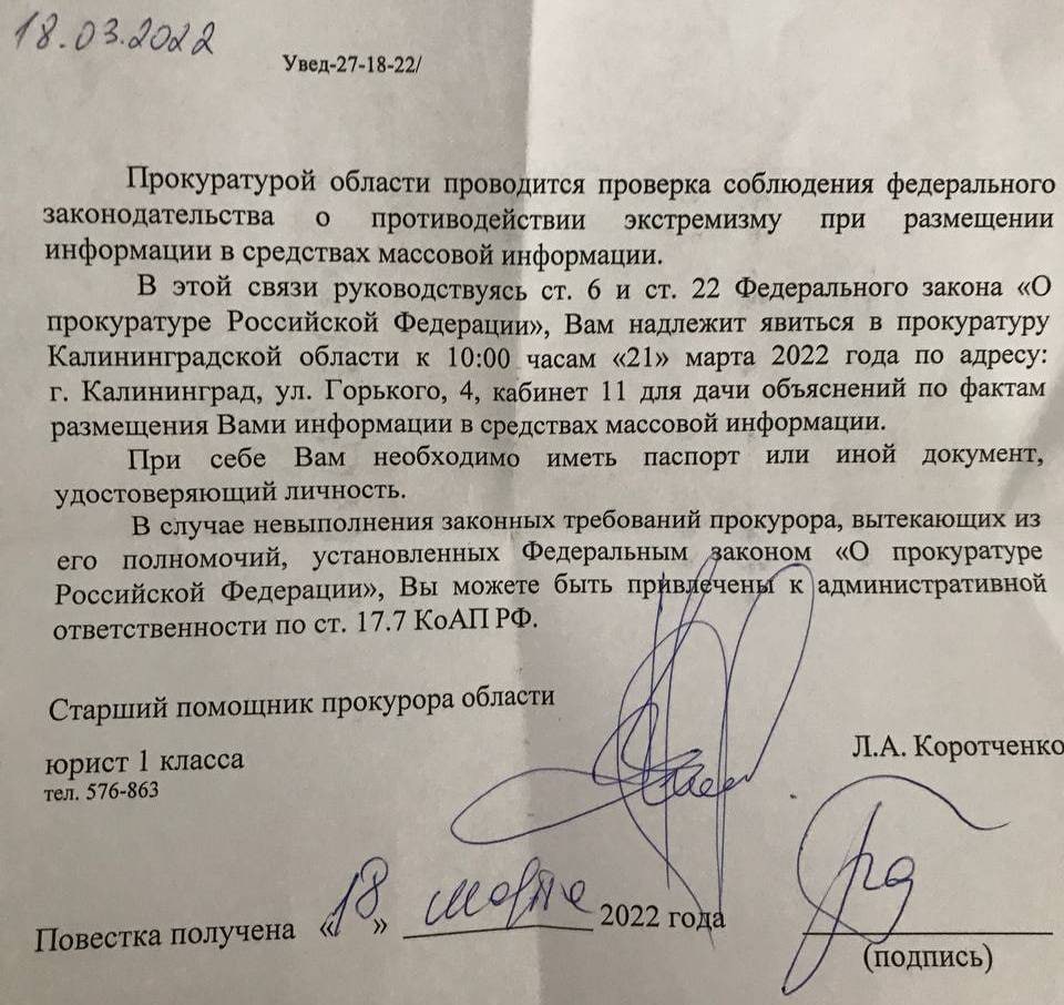 В повестке говорится, что прокуратура проводит проверку соблюдения закона о противодействии экстремизму при размещении информации в СМИ.