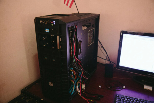 Рабочее место продавца «Пакета» напоминает комнату хакера-любителя: у системного блока снята крышка, множество кабелей оттуда тянется к стойкам, где находятся десятки жёстких дисков, а на двух мониторах отображается мудрёная программа управления файлами.