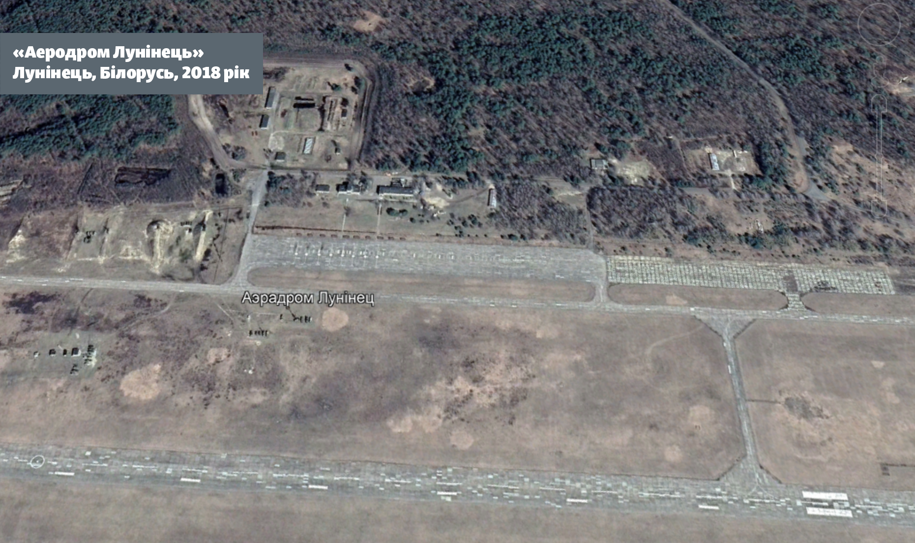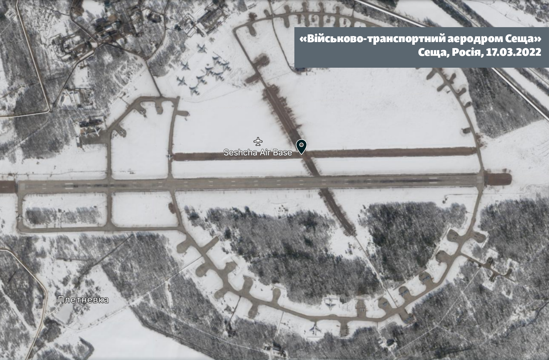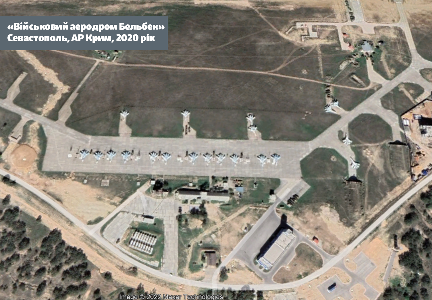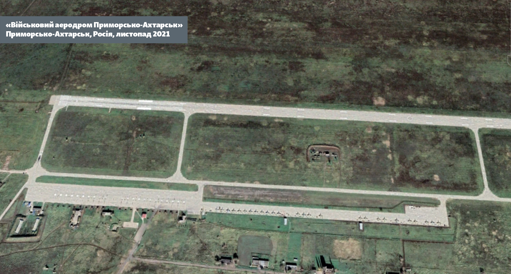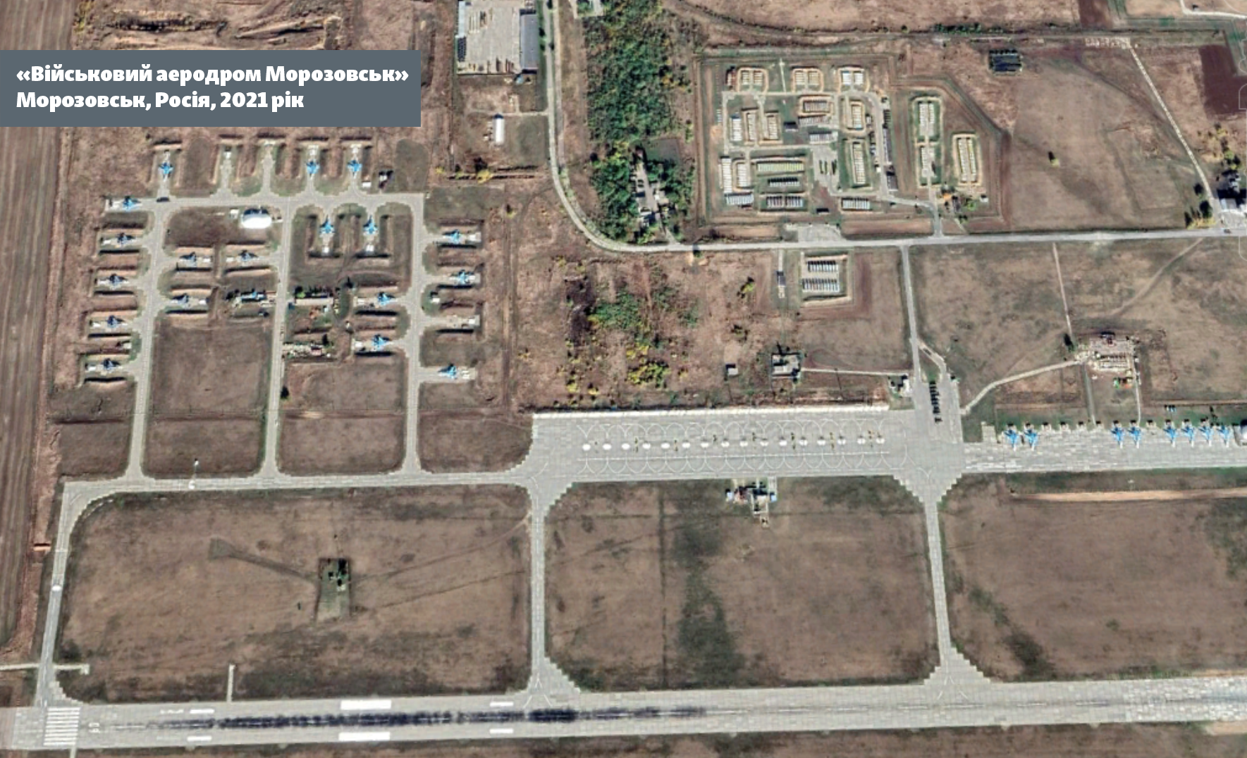 На снимках Maxar для GoogleMaps видно, что в 2018 году аэродром стоял пустым и та же картина была и в начале 2022 года перед началом полномасштабного вторжения. Это объясняется тем, что у этого аэродрома статус запасного.