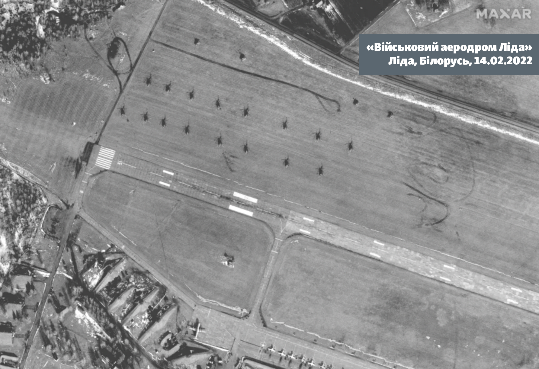 На последнем детальном снимке спутниковой системы Planet за 14 февраля 2022 года также не видно серьезных изменений в количестве самолетов, но рядом со взлетной полосой уже можно увидеть более 20 вертолетов, которых там раньше не было. Это может свидетельствовать о начале активного перекидывания военных России еще во время так называемых «учений».
