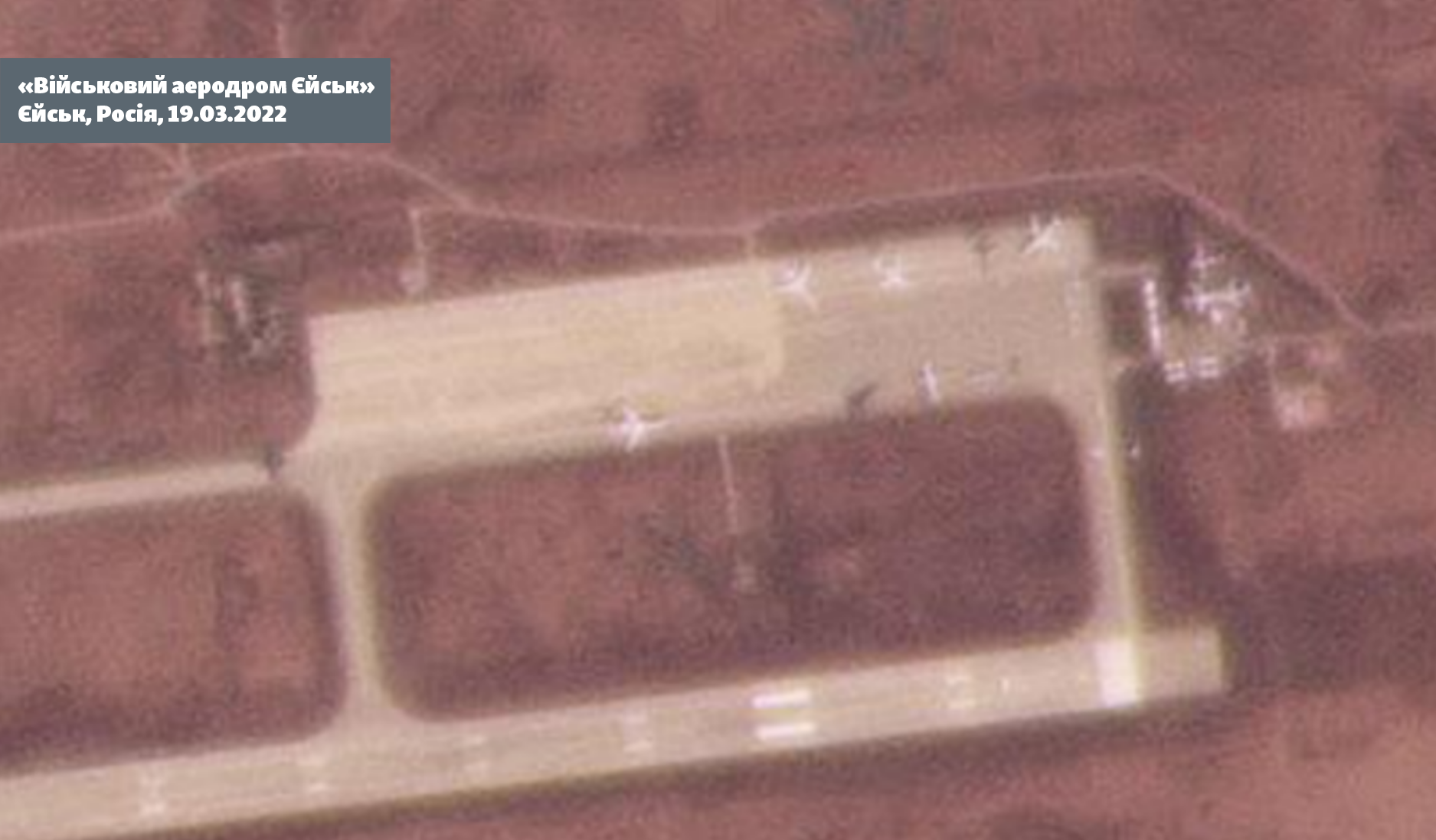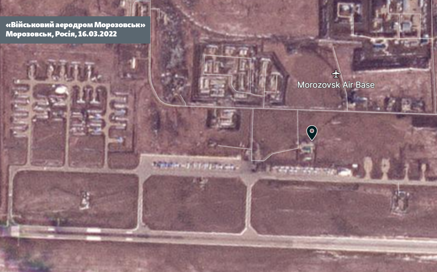 Даже до полномасштабного вторжения на этом аэродроме базировалось множество военных самолетов, что подтверждает снимок Maxar за ноябрь 2021 года. На нем видны более 20 бомбардировщиков Су-34. Ближе к новому вторжению России на территорию Украины 24 февраля 2022 года мы видим на спутниковых снимках, что на аэродроме появились дополнительные военные самолеты, теперь их уже больше 30. Такая же картина и на 20-й день вторжения.