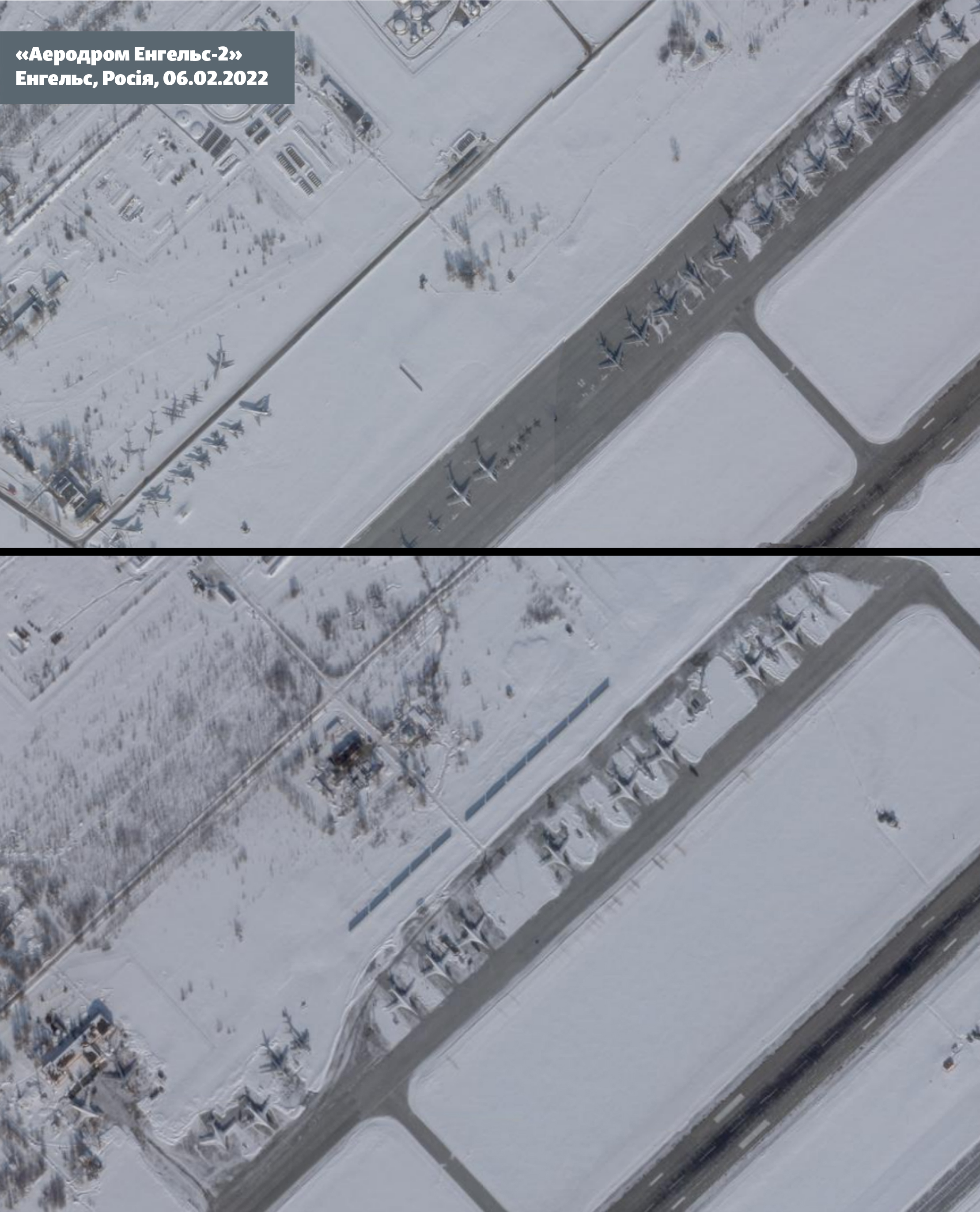 Ближайший к Украине известный аэродром стратегической авиации – авиабаза в городе Энгельс Саратовской области. Там базируются такие стратегические бомбардировщики как Ту-160 и Ту-95МС, которые видны на спутниковых снимках от 6 февраля.
