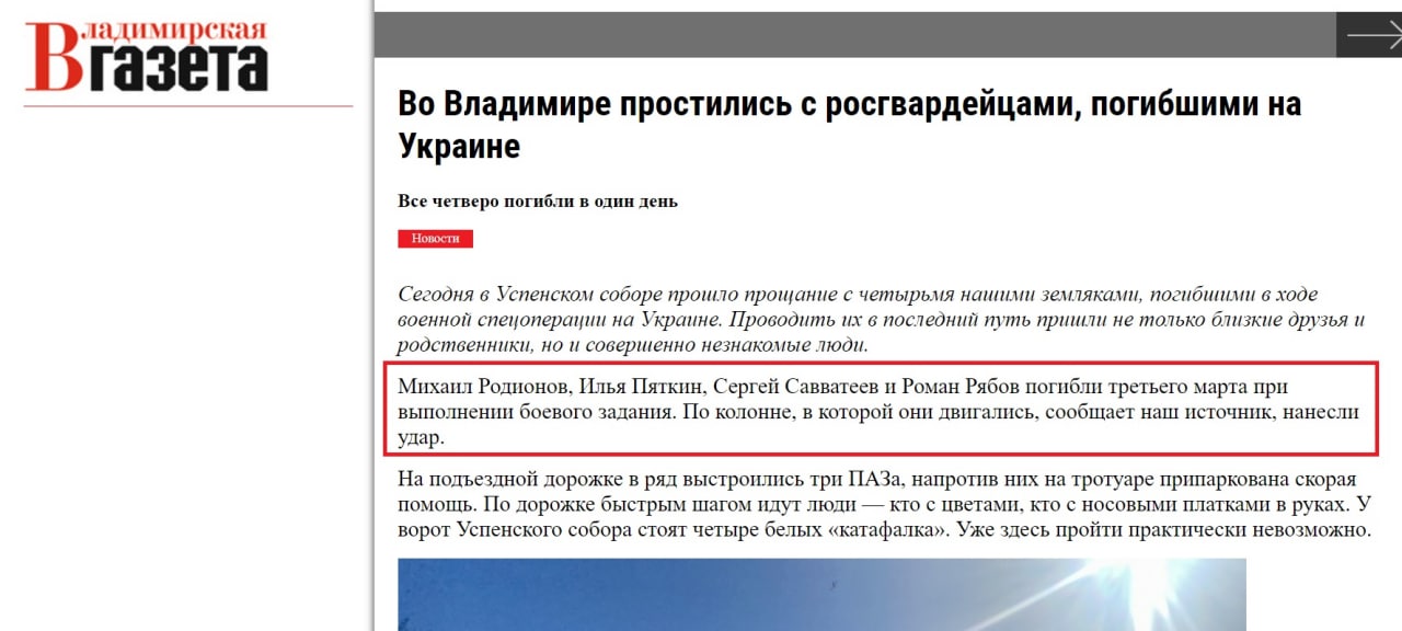 Во Владимире похоронили четверых офицеров местного отряда СОБР — троих подполковников и одного полковника. Местные СМИ написали об этом, но позже отредактировали статьи, убрав фамилии. Сотрудники Росгвардии погибли под Харьковом, съемки разбитой и обгорелой техники, на которой они ехали к городу, были опубликованы в социальных сетях. «Медиазоне» удалось выяснить имя еще одного погибшего, а также пообщаться с источниками, считающими, что всего при атаке на ту колонну могли быть убиты по меньшей мере 40 человек.