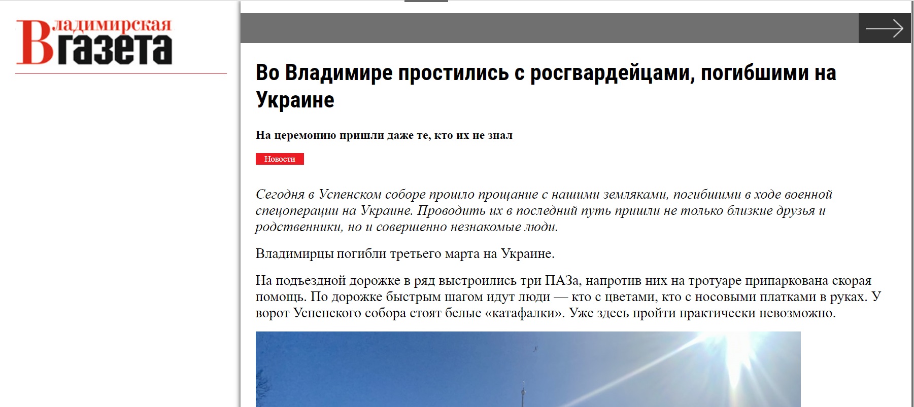 В пятницу, 18 марта, в Успенском соборе Владимира прошло отпевание собровцев. На богослужении были местные журналисты. Они написали о похоронах, назвав имена погибших. Позже эти публикации были отредактированы, а фамилии исчезли.