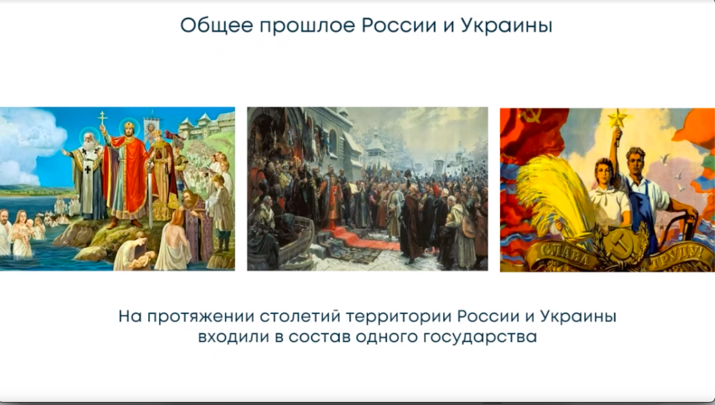 Согласно презентации, Россия не начинала войну, а вмешалась в идущий восемь лет конфликт, у России для этого есть все юридические обоснования, которые заключаются в подписанных с ЛНР и ДНР договорах, "американцы и европейцы дали украинцам несбыточные мечты и надежды, на вступление в Евросоюз и НАТО, сея раздор между нашими народами" (пунктуация оригинала).