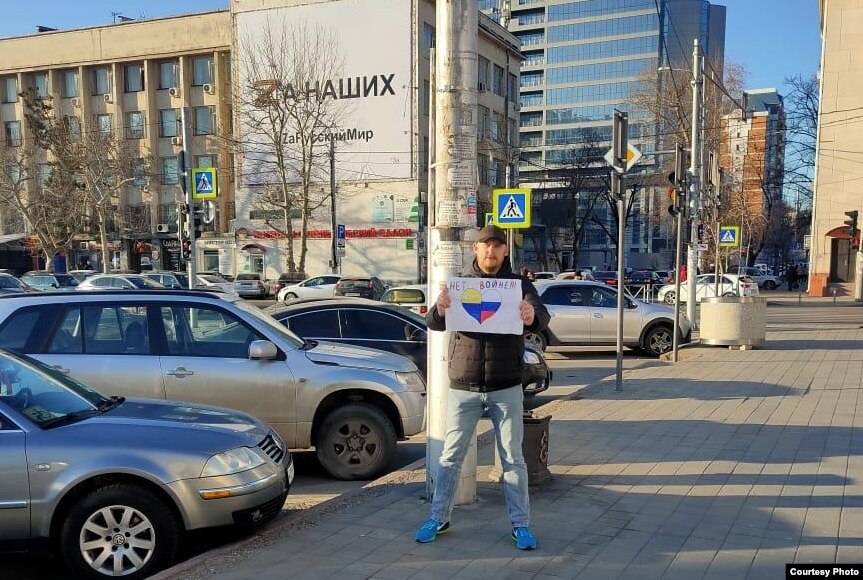 Пикет проходил 22 марта рядом с мэрией Краснодара и длился около минуты, рассказал сам Александр Рунов. Он вышел к администрации с плакатом "Нет войне" и рисунком сердечка, раскрашенного в цвета флагов России и Украины.