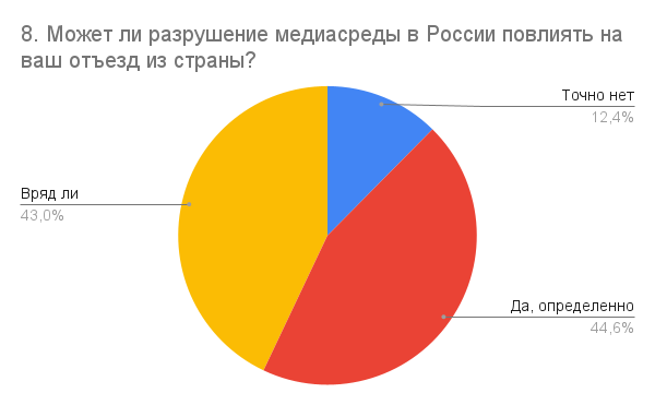 На вопрос «Может ли разрушение медиасреды в России повлиять на ваш отъезд из страны?» 44,6 % ответили утвердительно. Примерно столько же (43 %) ответили, что ситуация вокруг российских медиа вряд ли повлияет на их отъезд, а 12,4 % выбрали вариант «Точно нет».