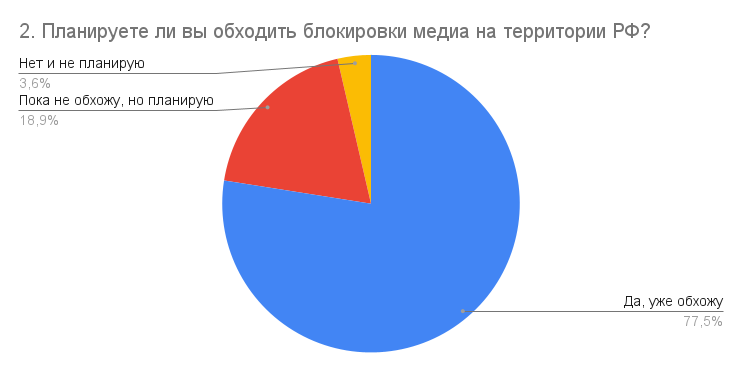 Подавляющее большинство (77,5 %) участников нашего опроса ответили, что уже обходят блокировки ресурсов на территории РФ. Примерно четверть респондентов (18,9 %) пока не начали, но планируют обходить блокировки. И еще 3,6 % не обходят и не планируют обходить ограничения.