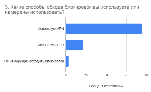 Для обхода блокировок 93,5 % опрошенных используют или намерены использовать VPN-сервисы. Технологию TOR используют или планируют 20,9 % — то есть часть пользователей хотят комбинировать эту технологию с VPN.
