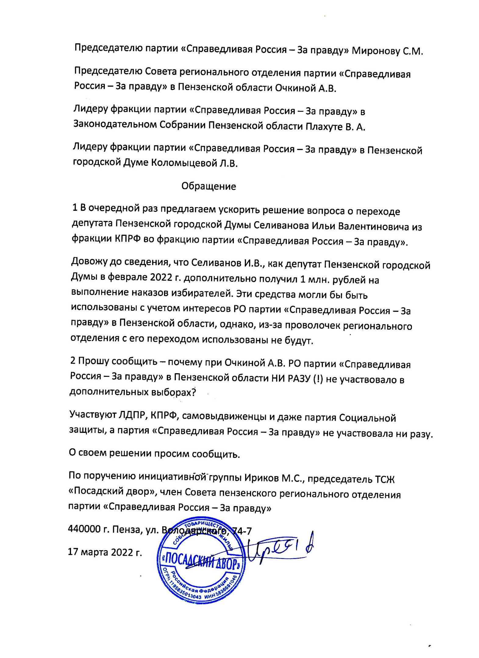 В понедельник 21 марта 2022 г. Председатель Совета регионального отделения партии «Справедливая Россия — За правду» в Пензенской области Анна Очкина написала заявление об отставке.