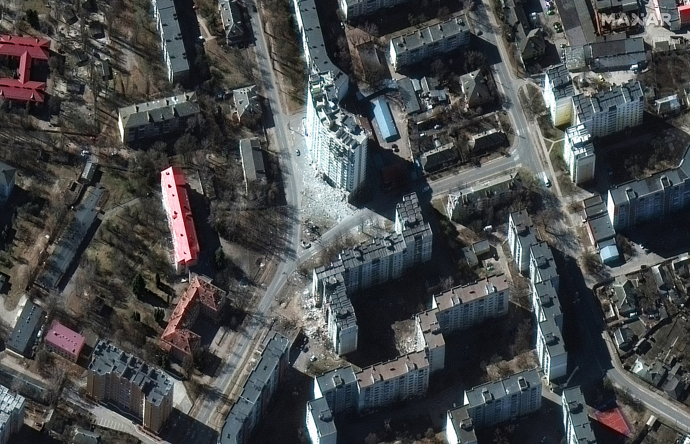 Спутниковый снимок поврежденных высотных жилых домов в Чернигове, 18 марта 2022 года. Фото: Maxar Technologies / Reuters