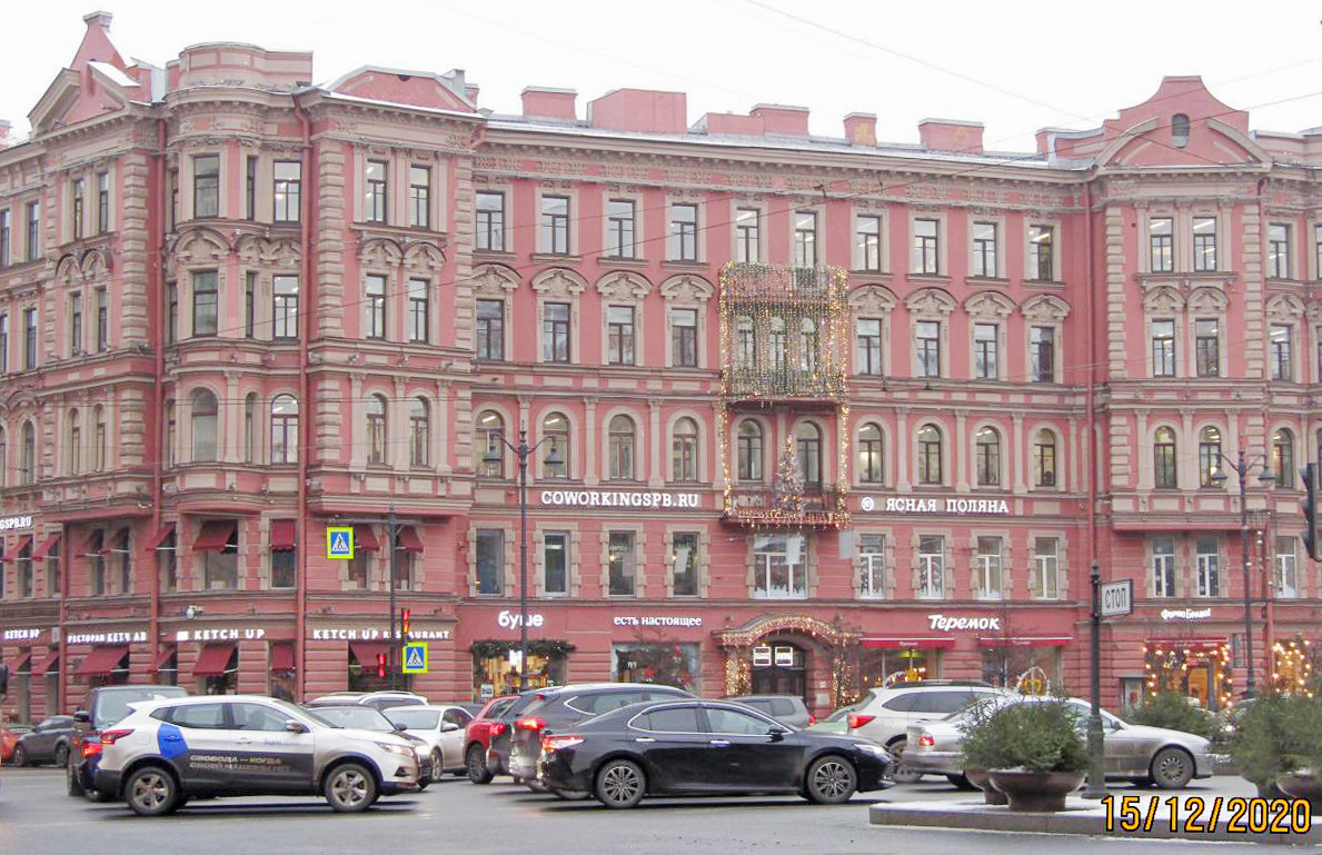 В пятиэтажном особняке на площади Льва Толстого есть эффектная открытая парадная. Это практически филиал музея эклектики: кованые перила, лепнина и деревянные двери здесь соседствуют с дизайнерской мебелью и освещением.