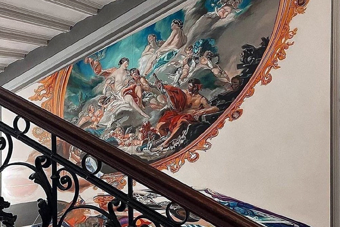 Но главное — пролеты украшают работы художников в стиле Кандинского, Дейнеки и современных авторов, а ренессансный сюжет выполнен в духе абстрактного экспрессионизма. В здании находится коворкинг «Ясная поляна», так что осмотреть парадную можно не тревожа жильцов.
