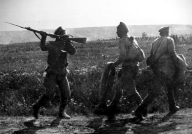 Русский солдат пытается остановить дезертиров. Юго-Западный фронт. 1917 год.