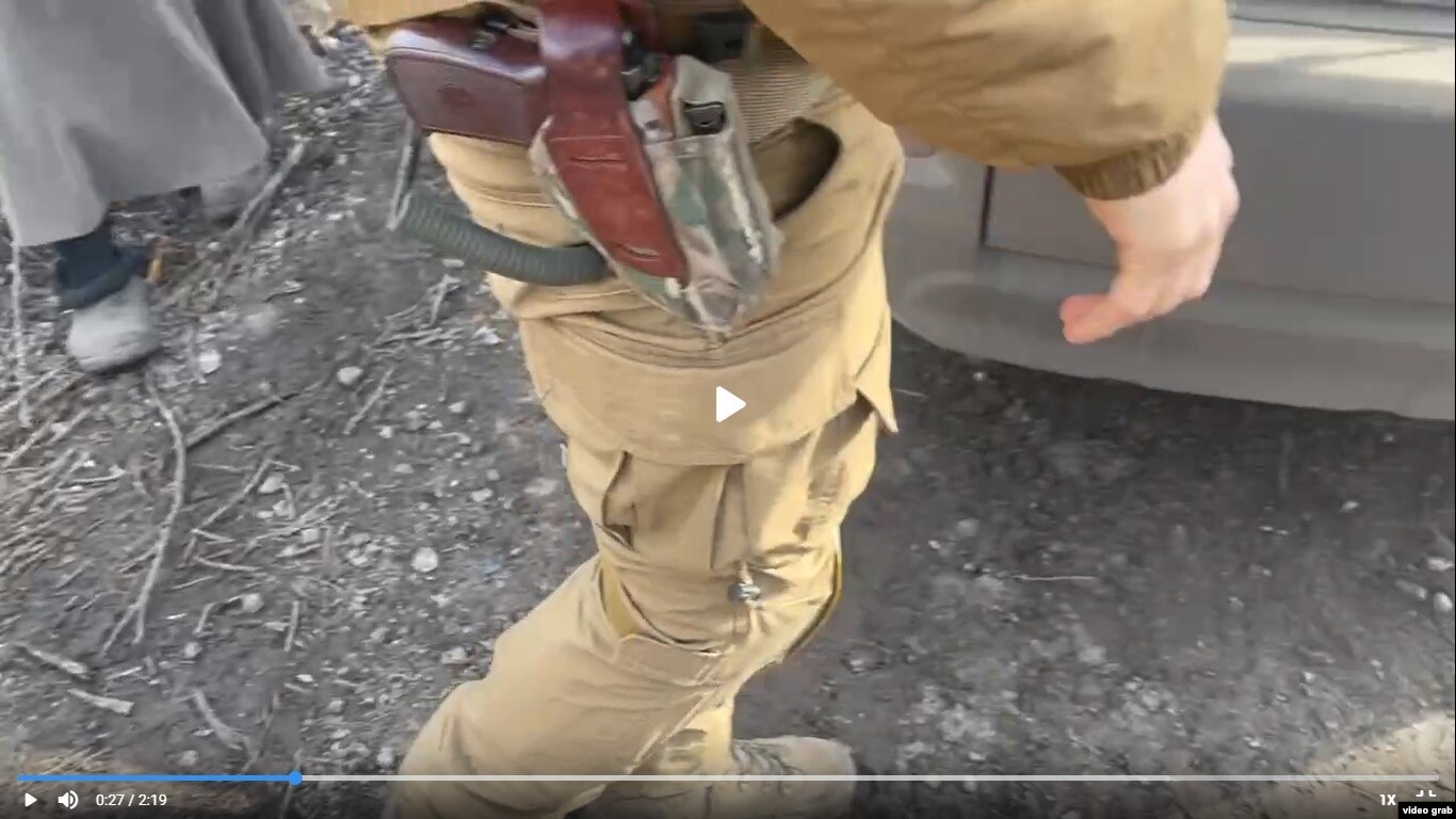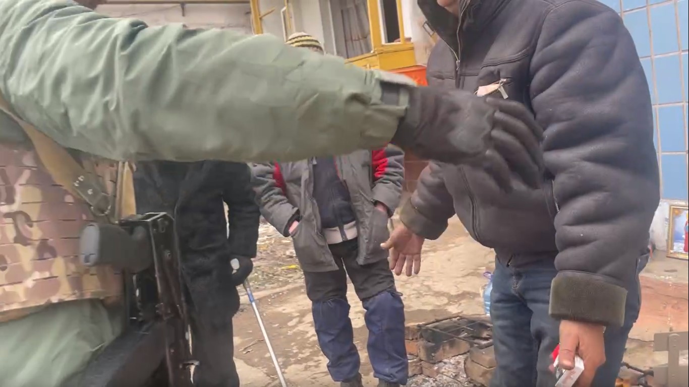На этом видео «благодетельствует» человек в каске и разгрузке с запасными магазинами к автомату.