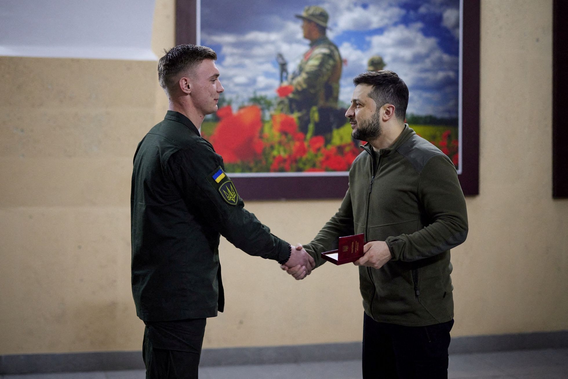 Владимир Зеленский награждает бойца Национальной гвардии