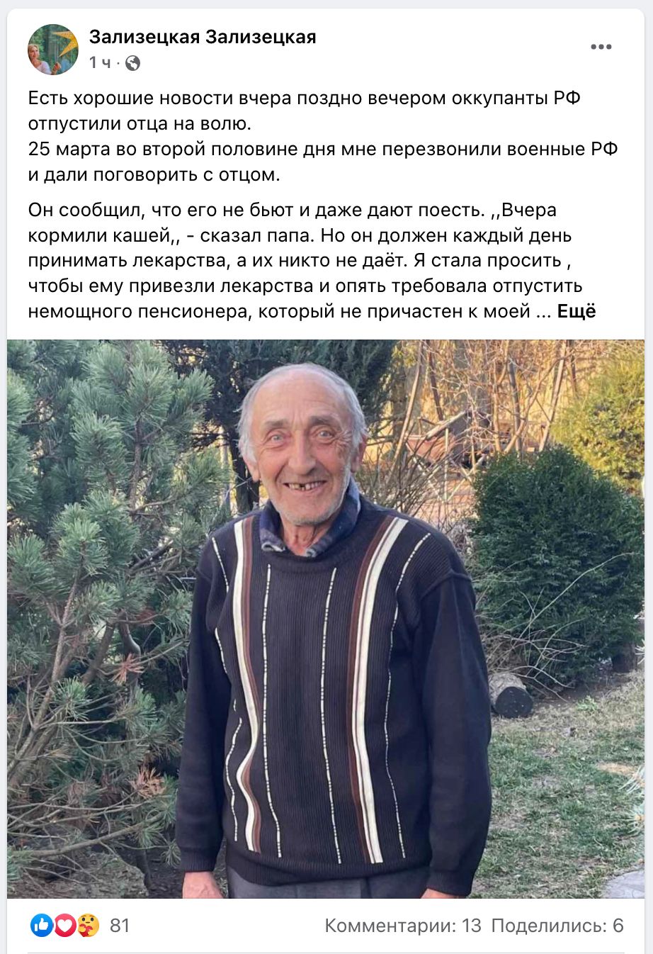 Журналистка из Мелитополя Светлана Зализецкая, 23 марта заявившая о похищении своего 75-летнего отца российскими военными, рассказала про его освобождение.
