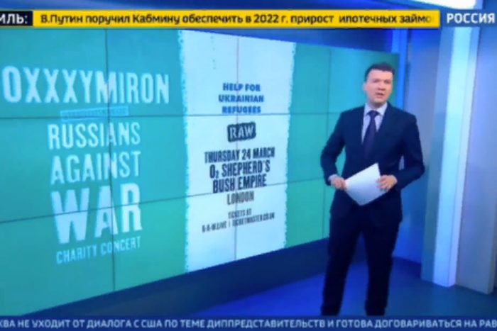 На «России 24» обсудили антивоенный тур Оксимирона Russians Against War. В эфире приглашенный «эксперт» назвал лозунг «Нет войне» нацистским.