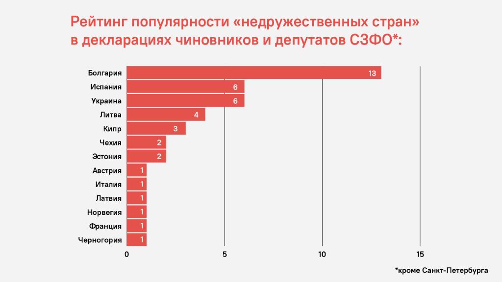 У архангельских чиновников из «недружественных» стран особой популярностью пользуется Болгария. Из заметных чиновников в этой стране имущество декларировала супруга Фёдора Терентьева, замминистра труда и социального развития. Супруга Сергея Моисеева, руководителя фракции «Единая Россия» в Архангельском областном парламенте, задекларировала не только квартиру в Болгарии, но и дом в такой же «недружественной» Франции. Председательница архангельской гордумы Валентина Сырова с супругом задекларировала сразу две квартиры на Кипре, а замруководителя жилинспекции Архангельской области Наталья Силуянова — пользование домом с участком в Черногории.