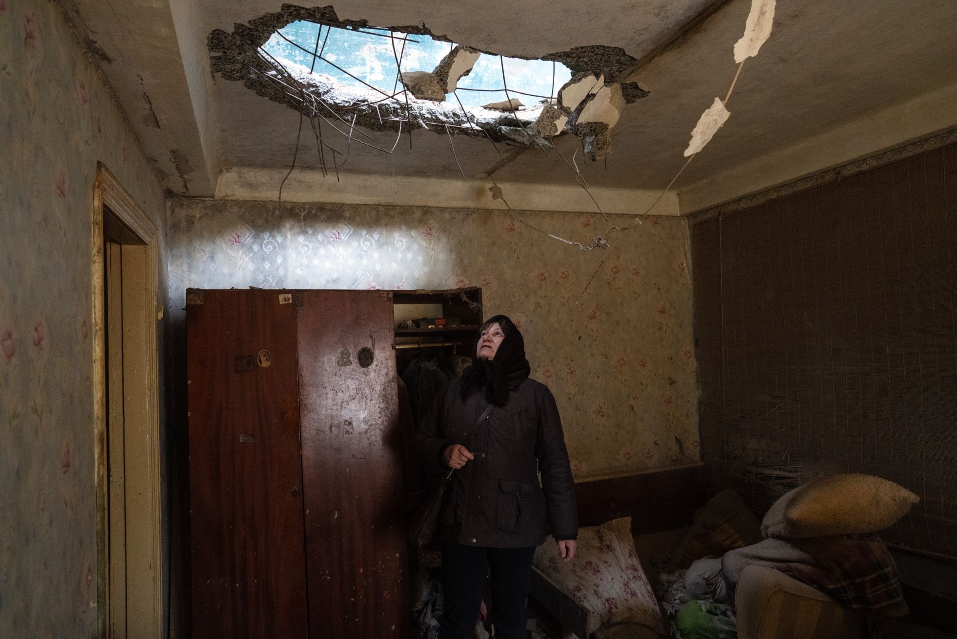 На этой фотографии Галина Фалько смотрит на разрушения в своем доме возле города Бровары в Киевской области. Ее дом, как утверждается, пострадал в результате российской атаки.