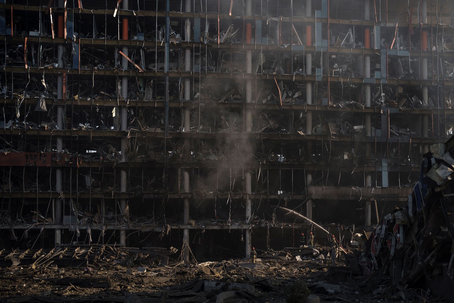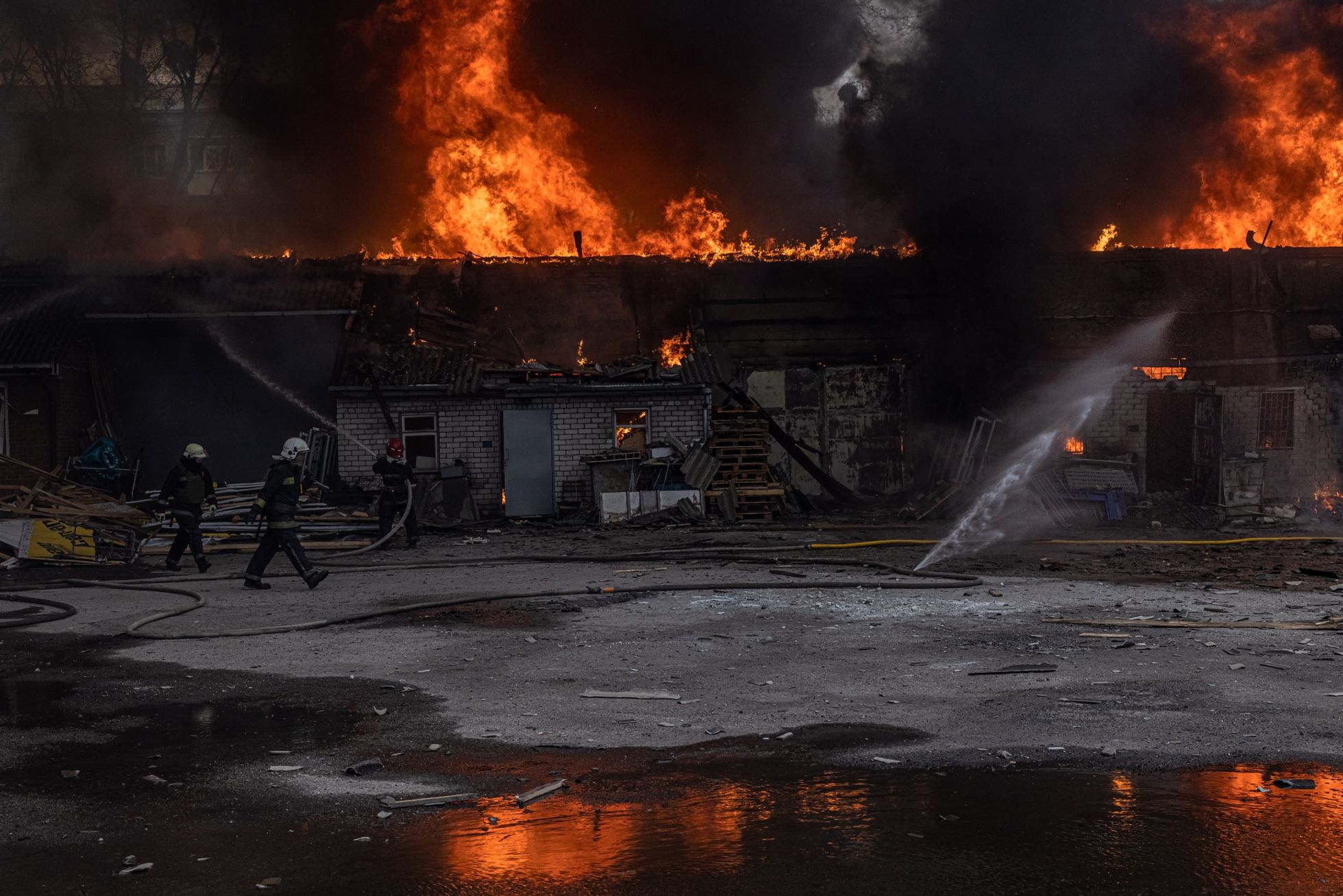 На этой фотографии пожарные тушат возгорание на складе в Харькове, начавшемся после артиллерийского удара, 28 марта 2022 года.