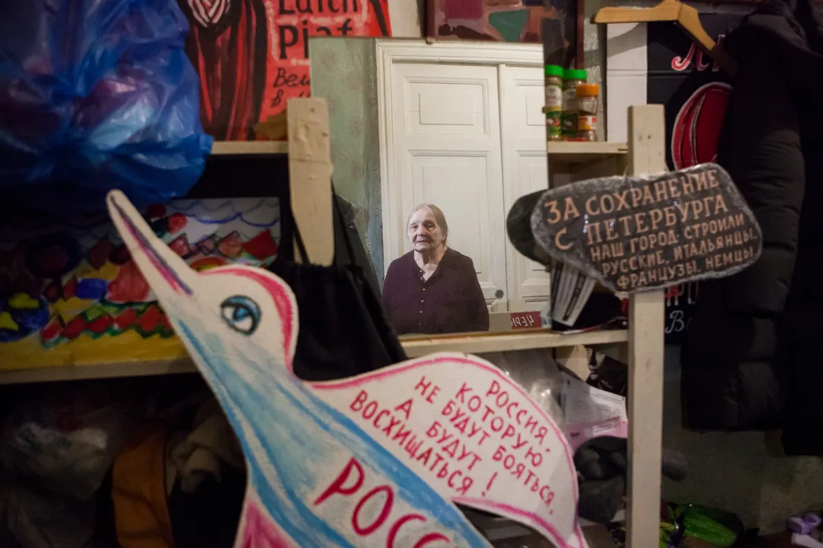 В доме постройки конца XIX века, где живет Елена Андреевна, никогда не было капремонта. Ее коммуналка заставлена мебелью, которую покупали не менее полувека назад. К приходу гостей художница достает новое маленькое белое полотенце с вышитыми елочными игрушками. Елена Андреевна угощает нас рисом с овощами. Раскладывает его по тарелкам со словами: «Это вкусно, там даже есть мясо». Радуется, что у нее в запасе есть пачка чая. Распаковывает ее, объясняя: на днях как малоимущей принесли продуктовый набор из собеса.